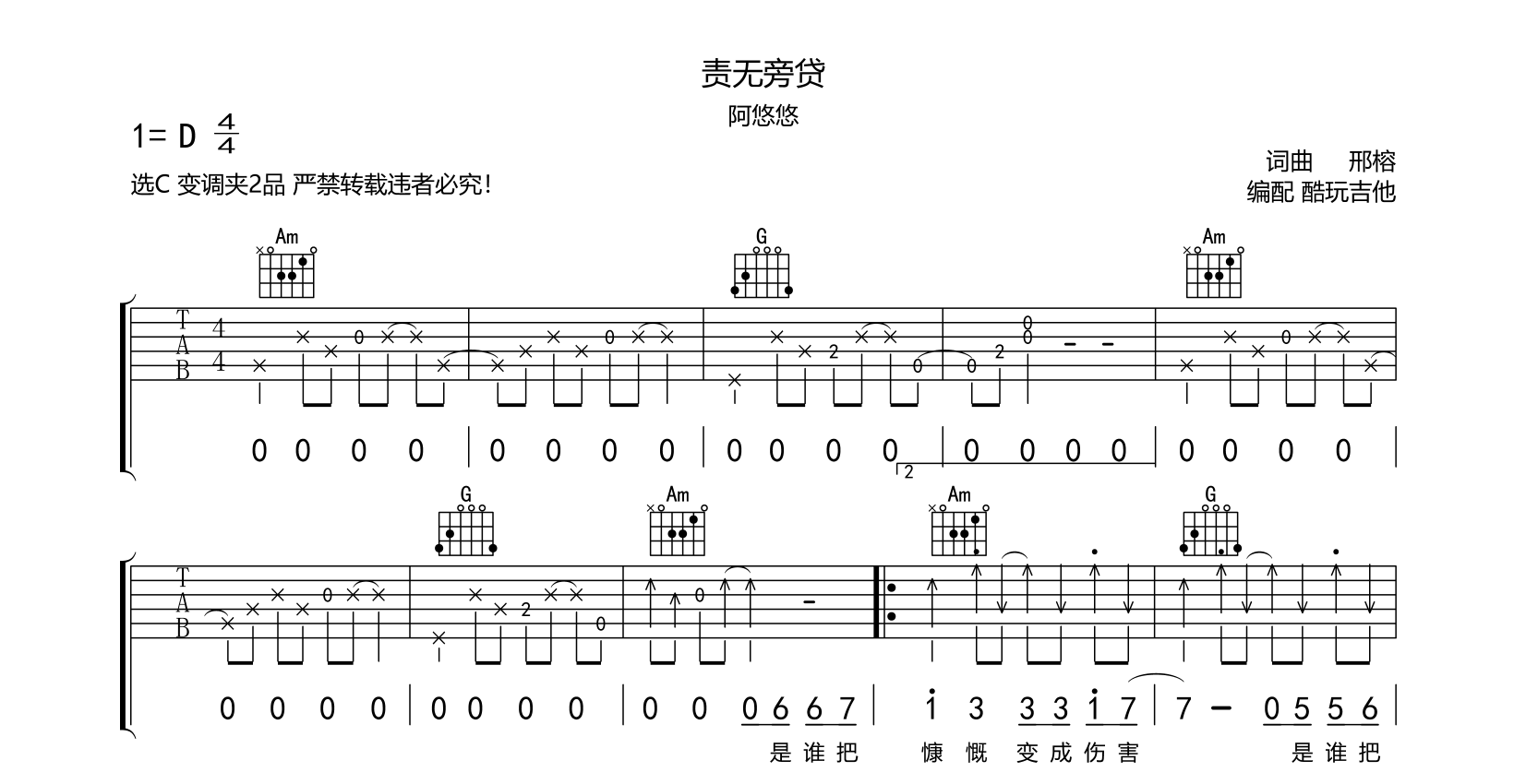 吉他责无旁贷 吉他谱 阿悠悠 抖音单曲 C调
