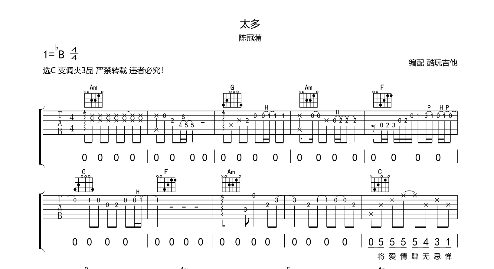 吉他太多 吉他谱 陈冠蒲 C调 附带前奏间奏尾奏