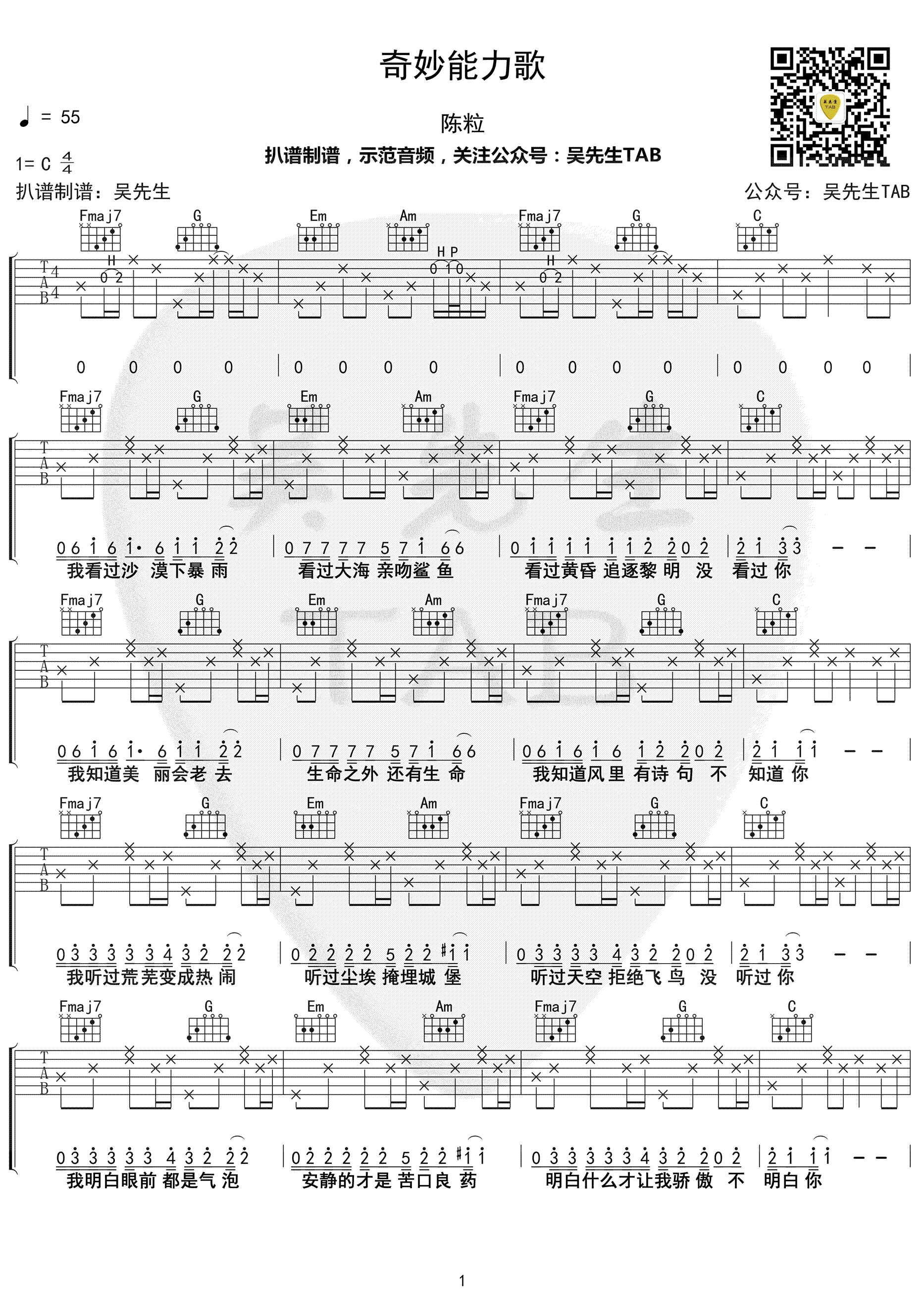 奇妙能力歌吉他谱,陈粒演唱的一首民谣代表歌曲,奇妙能力歌六线谱,C调指法高清弹唱图片谱,吴先生编配分享...