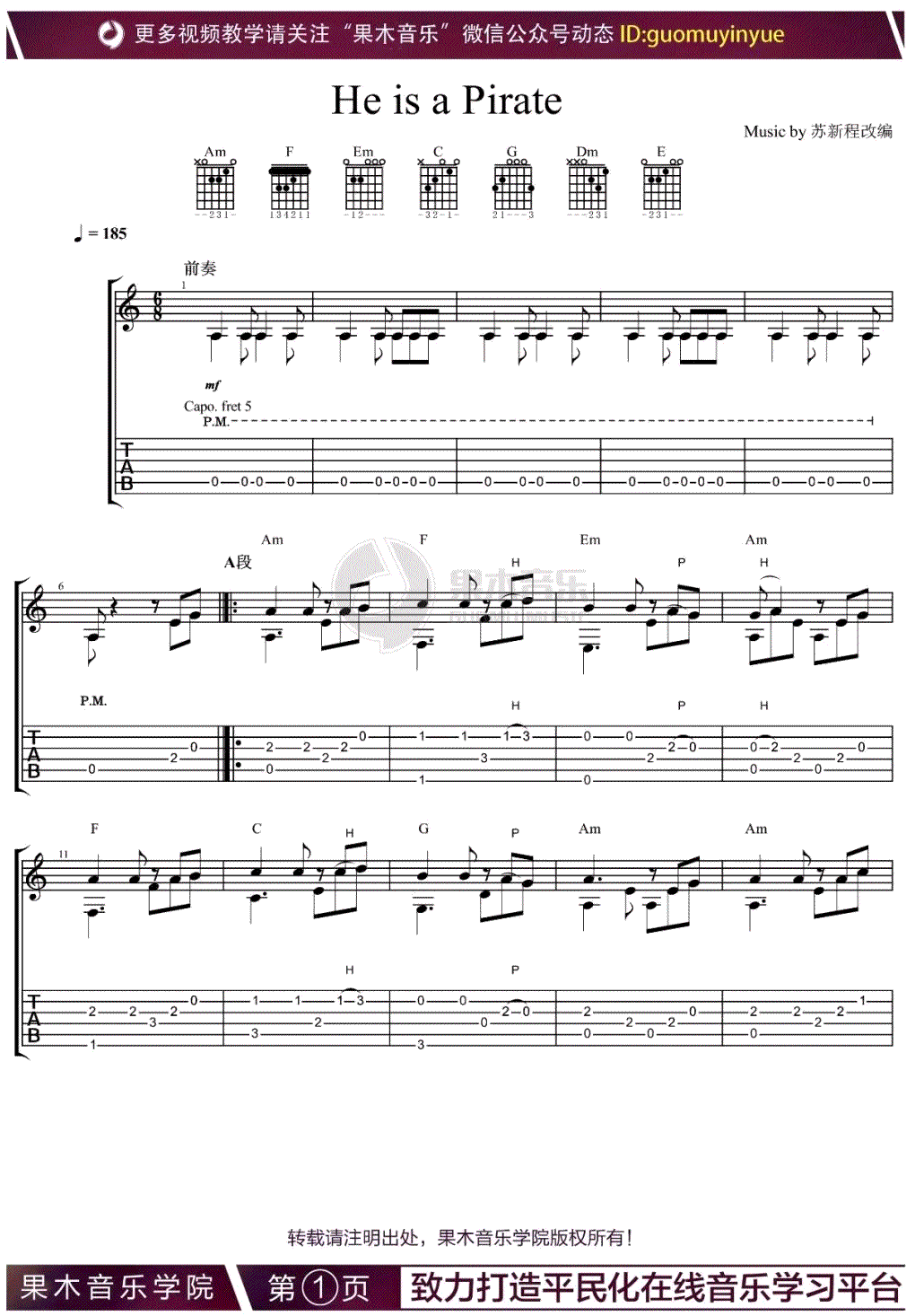 加勒比海盗指弹谱,同名电影《加勒比海盗》主题曲,Heisapirates吉他独奏谱,完整版共四张图片谱,感谢果木音乐苏新程改编...