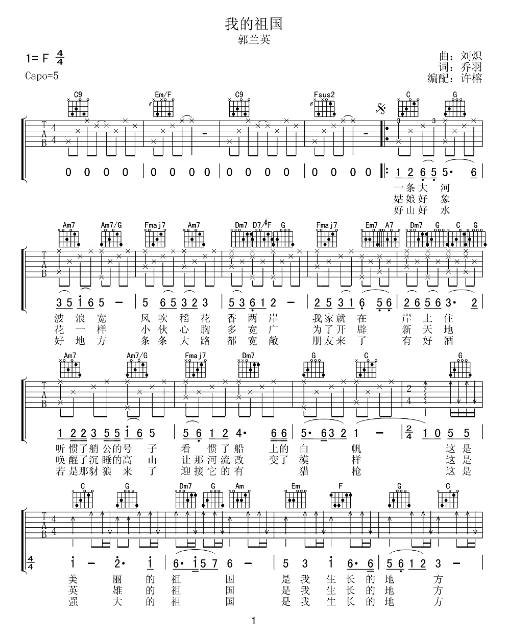 我的祖国》吉他谱,郭兰英演唱的一首经典爱国主义歌曲,也是老电影《上甘岭》的主题歌,我的祖国六线谱,原调F,选用C调,变调夹夹五品。感谢许榕编配分享...