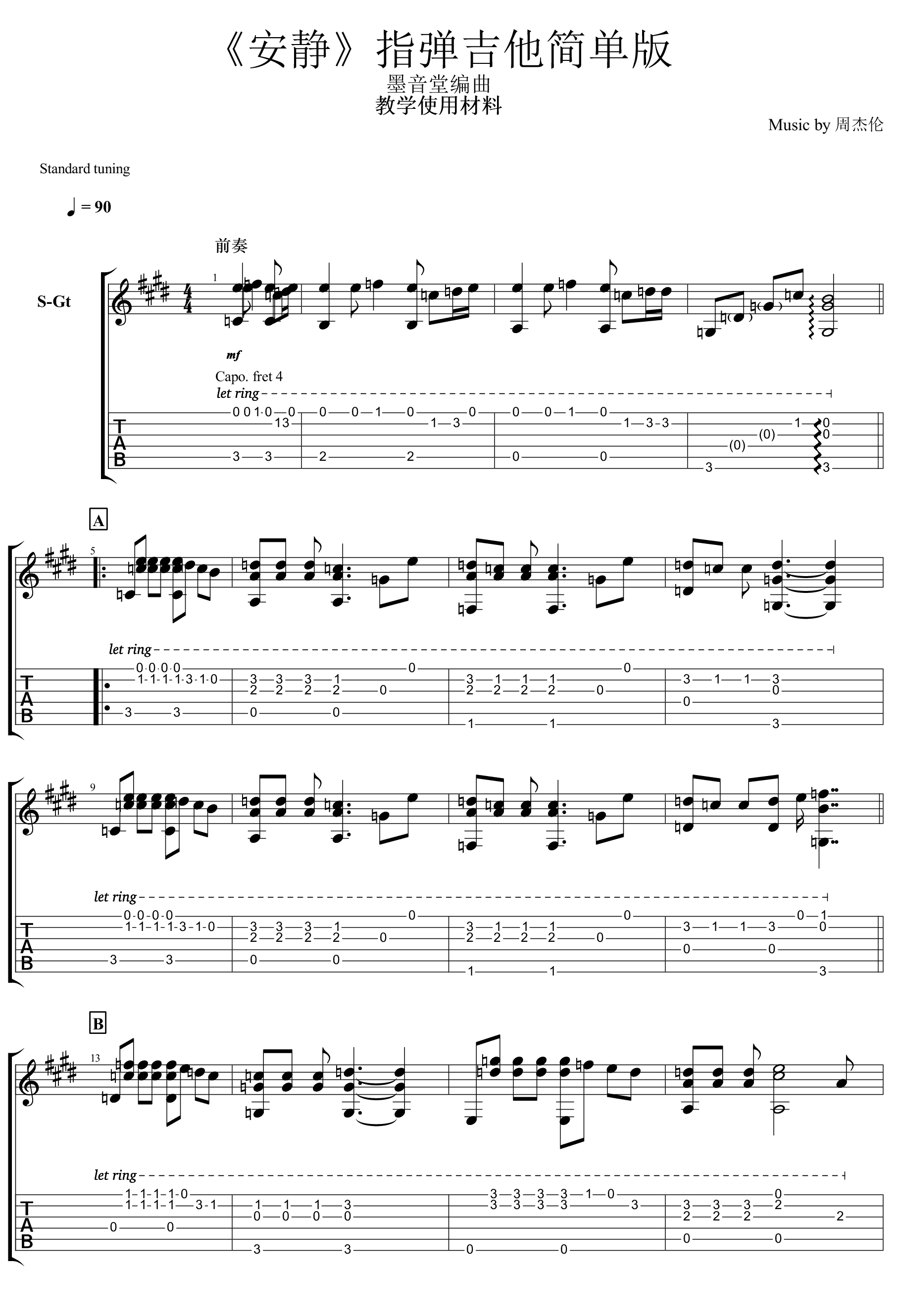 《安静》指弹吉他谱,周杰伦的一首代表歌曲改编,安静吉他独奏谱,高清图片谱,感谢墨音堂编配出品...