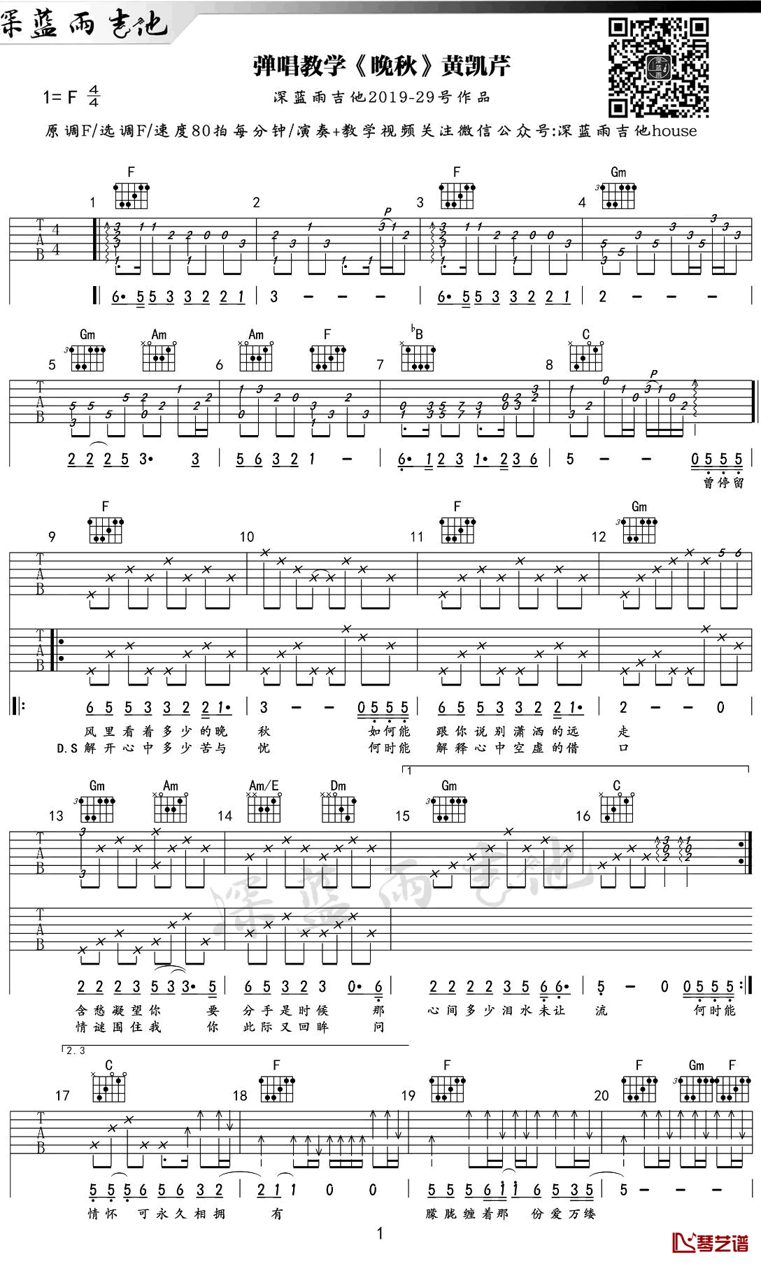晚秋吉他谱,歌曲采用F调指法编配,黄凯芹演唱的歌曲,晚秋弹唱六线谱,感谢深蓝雨吉他编配制作...