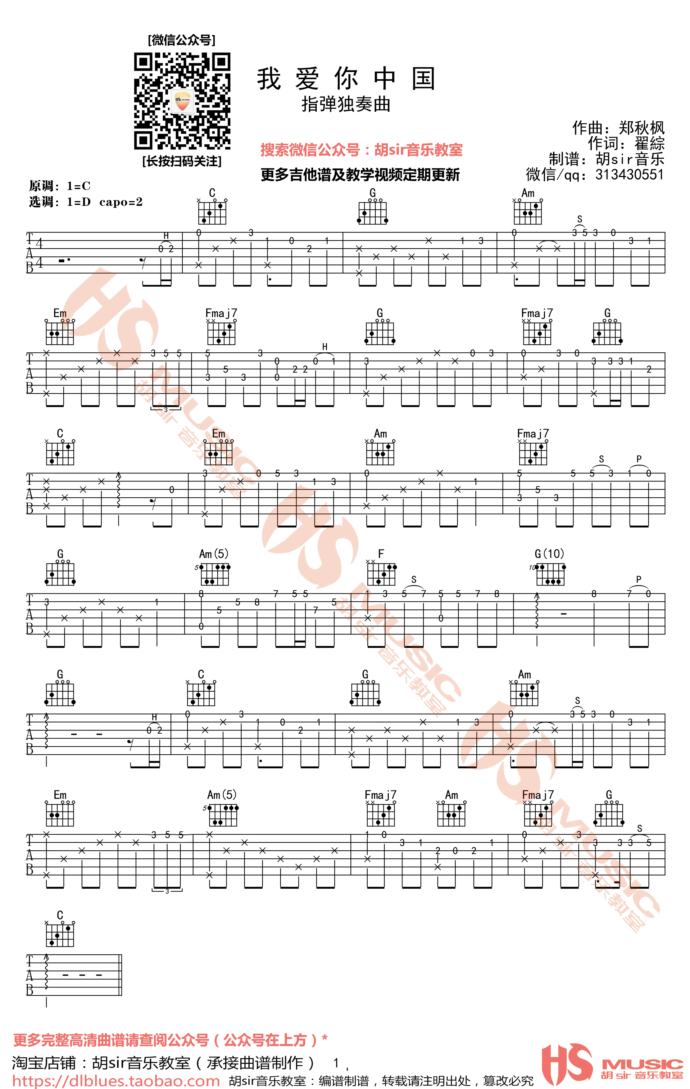 我爱你中国指弹吉他谱,叶佩英原唱,一首广为传唱经久不衰的爱国主义歌曲,也是老电影《海外赤子》的插曲。我爱你中国吉他独奏谱,原调C,选调D,变调夹夹二品,高清图片六线谱,感谢胡sir音乐教室编配出品...