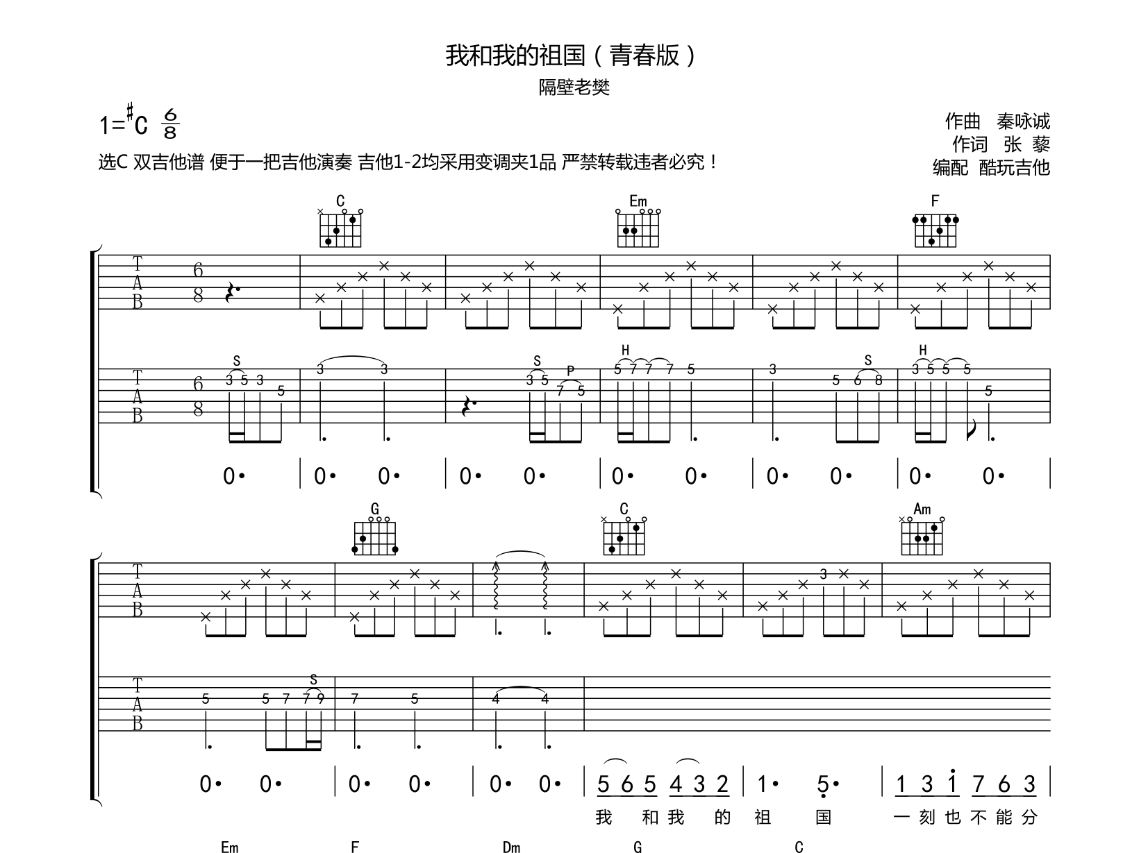吉他我和我的祖国 吉他谱 隔壁老樊最新单曲 还原效果编配附SOLO