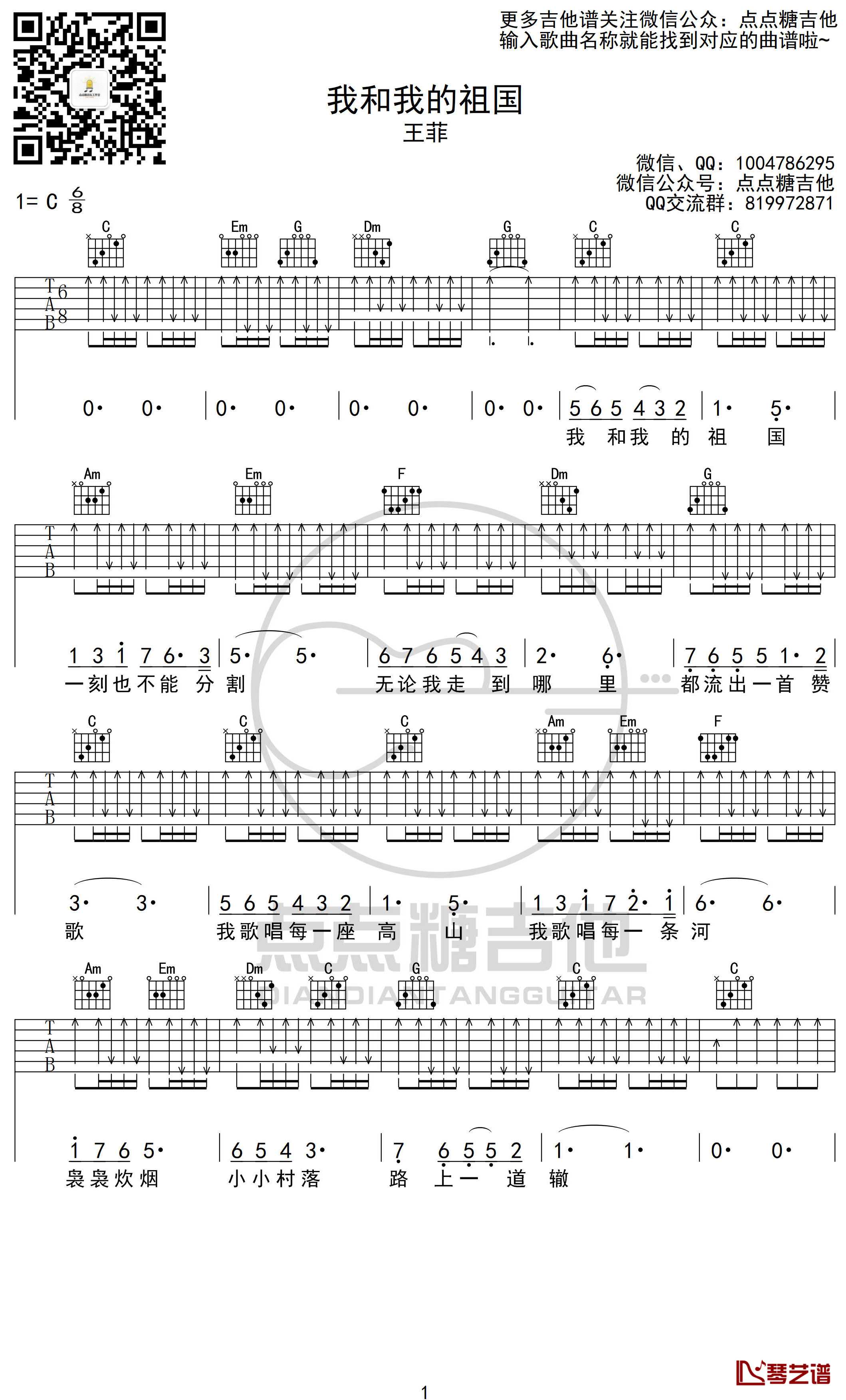 吉他我和我的祖国吉他谱 王菲 C调弹唱六线谱 扫弦版