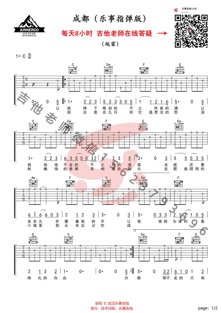 吉他赵雷《成都》吉他谱 C调指弹谱