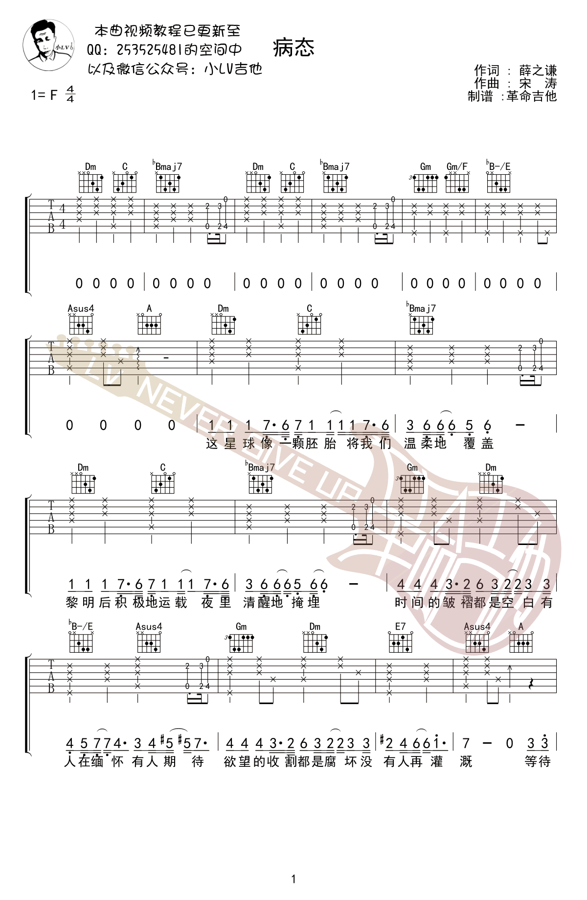 病态》吉他谱,薛之谦演唱的一首新歌作品,在19年中秋节正式发布,病态六线谱,F调弹唱谱,完整版共四张高清图片谱,感谢小LV吉他编配出品...