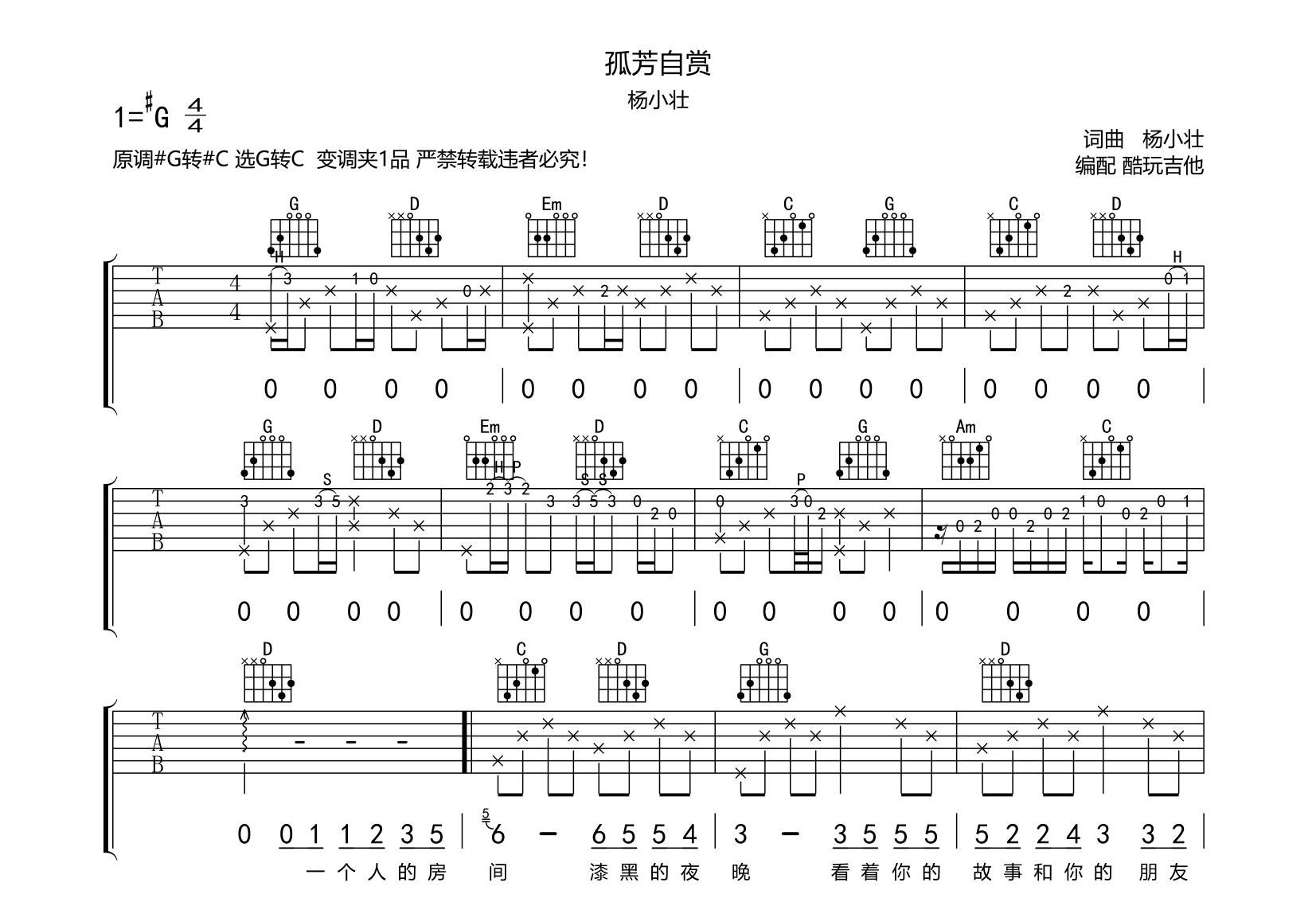 吉他孤芳自赏 吉他谱 最新抖音热门 杨小壮