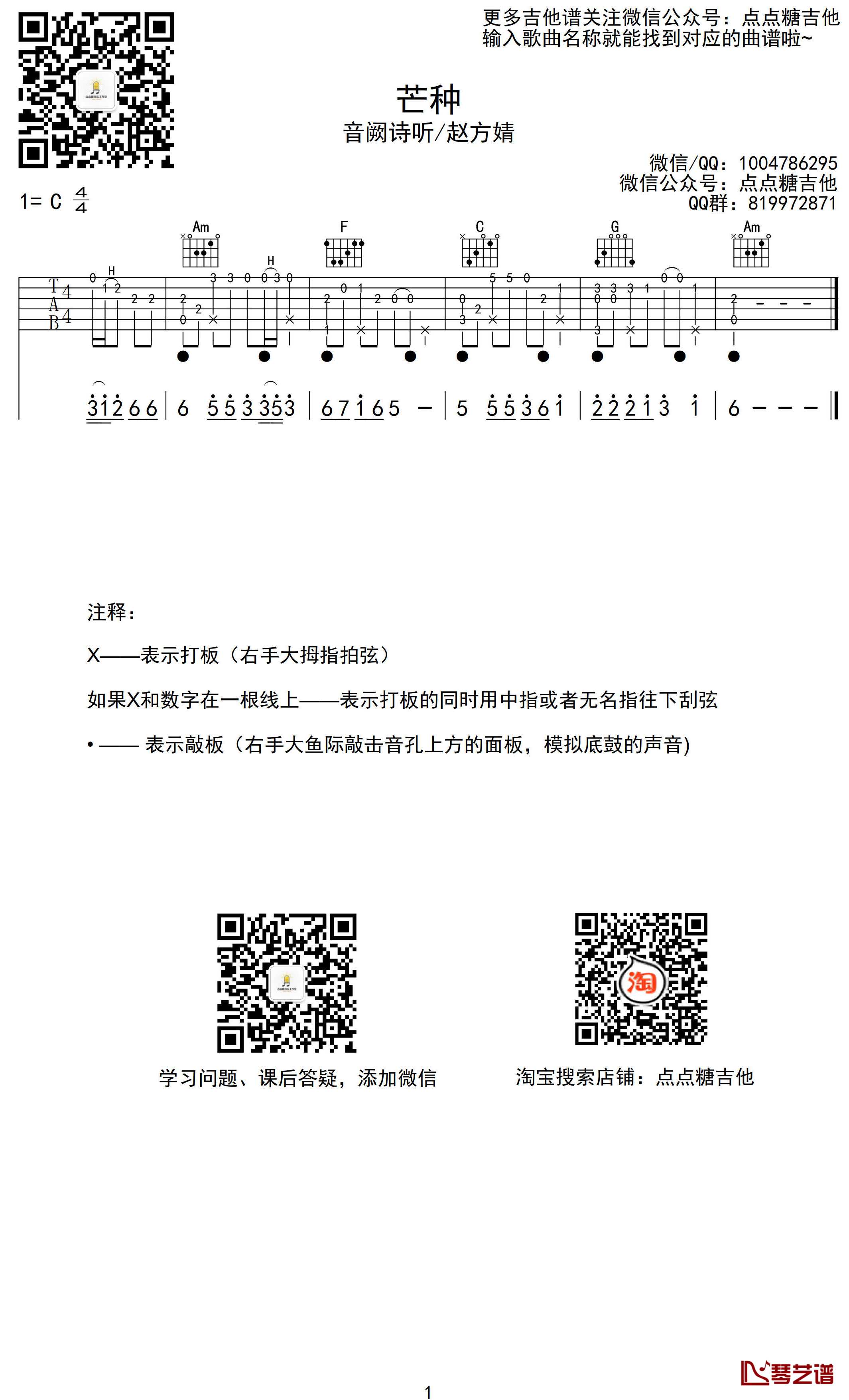 《芒种》这首歌我选用的是C调指法编配,不夹变调夹。弹的时候一定要参考、结合所提示的和弦来演奏,还有谱子下方技巧的注释要理解清楚哦,难点在于敲板,有些拍是后半拍敲板,比较不好把握,建议开始学的时候可以不用敲板,一步一步来。...