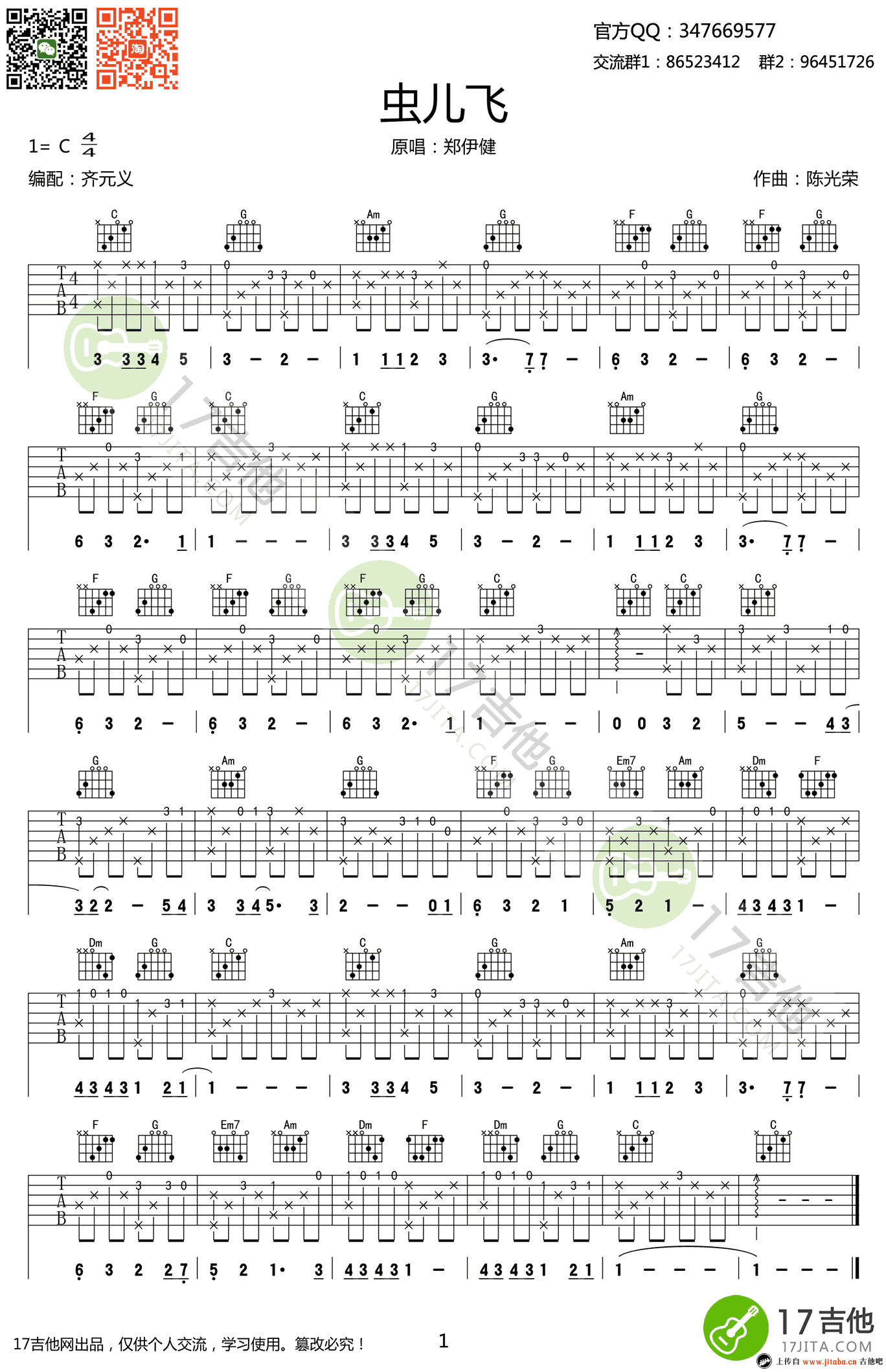 虫儿飞指弹吉他谱,C调指法,吉他初级练习曲,该曲旋律优美,简单易学。郑伊健为香港电影《风云雄霸天下》演唱的一首类似童谣风格的浪漫歌曲,虫儿飞吉他独奏谱,曲谱为高清图片谱格式,感谢齐元义编配。...