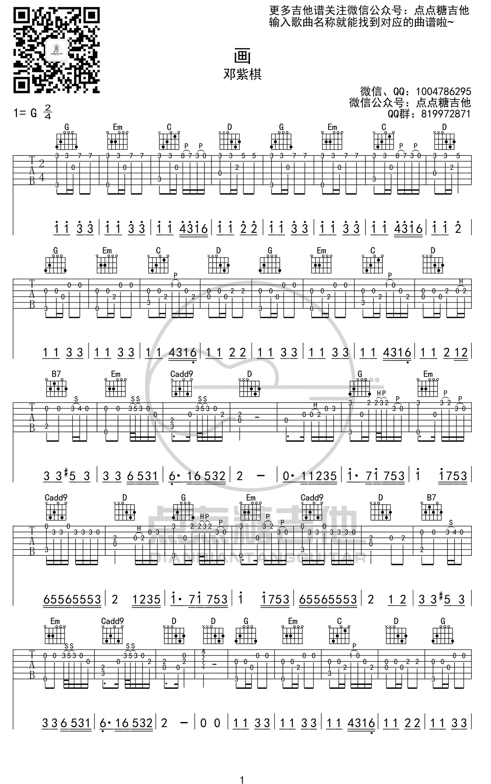 邓紫棋《画》指弹吉他谱,独奏改编,画吉他指弹谱,点点糖编配...