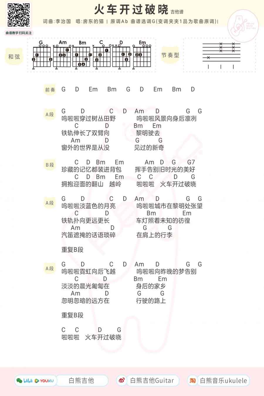 火车开过破晓吉他谱,曲谱选G调和弦编配,(变调夹1品为歌曲原调)。房东的猫新歌:火车开过破晓吉他弹唱谱,共图片六线谱一页。...