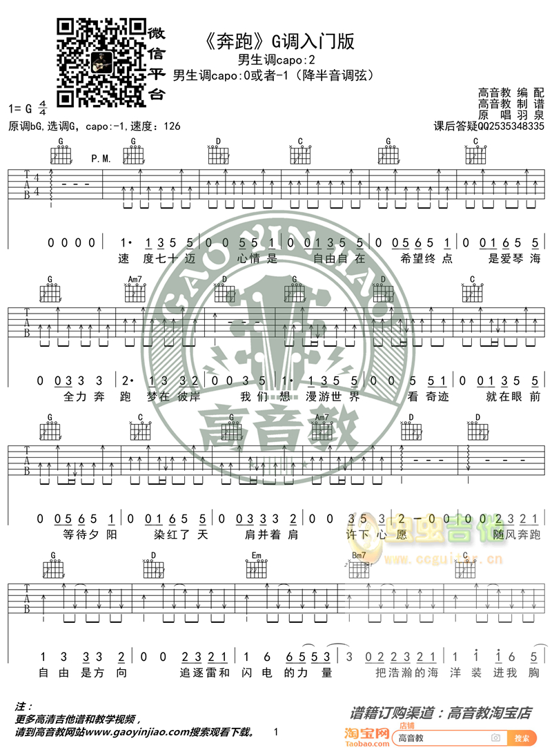 《奔跑》入门版羽泉高音教编配猴哥吉他教学选G原调琴弦需全部降半音...
