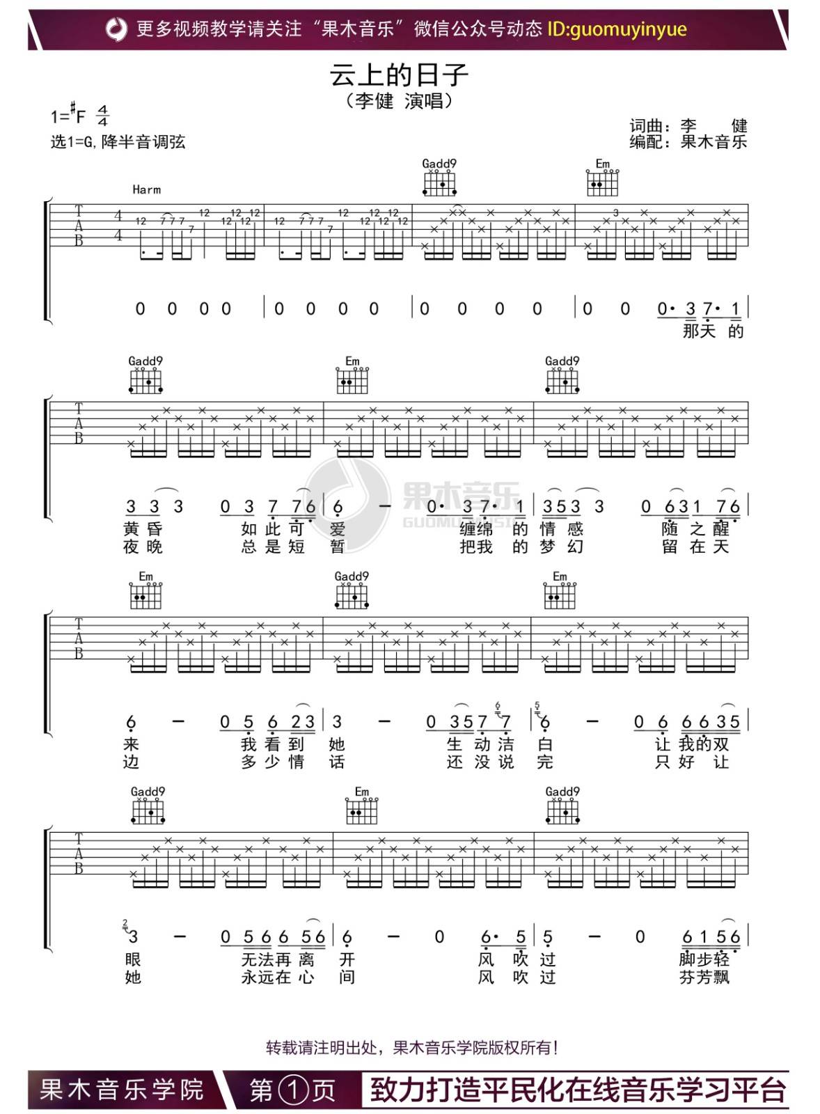 音乐诗人李健《云上的日子》吉他谱分享,来自果木音乐编配G调弹唱六线谱,原调#F,弹唱降半音调弦。...