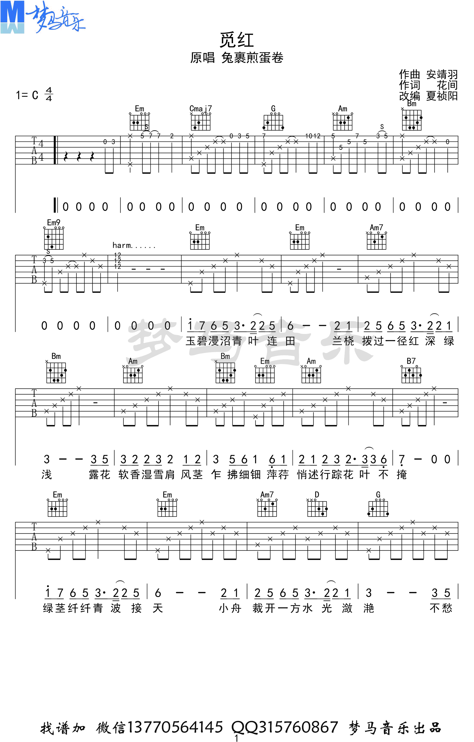 觅红》吉他谱,兔裹煎蛋卷演唱的一首小众古风歌曲,觅红六线谱,C调指法,完整版共四张高清图片谱。随梦马音乐出品...