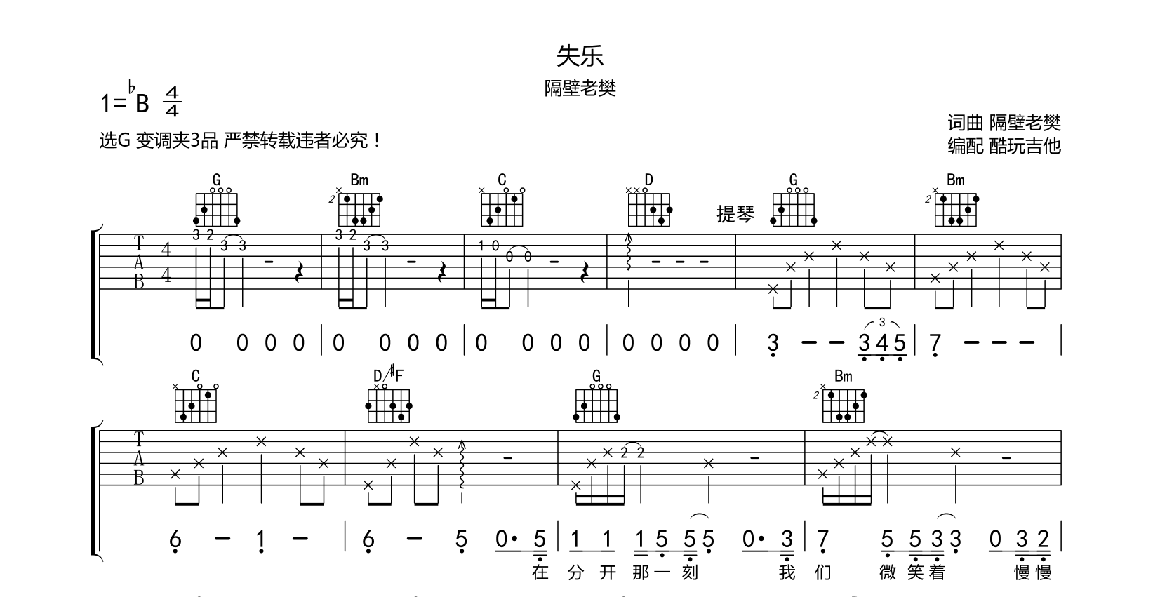 吉他失乐 吉他谱 隔壁老樊最新单曲 六线谱