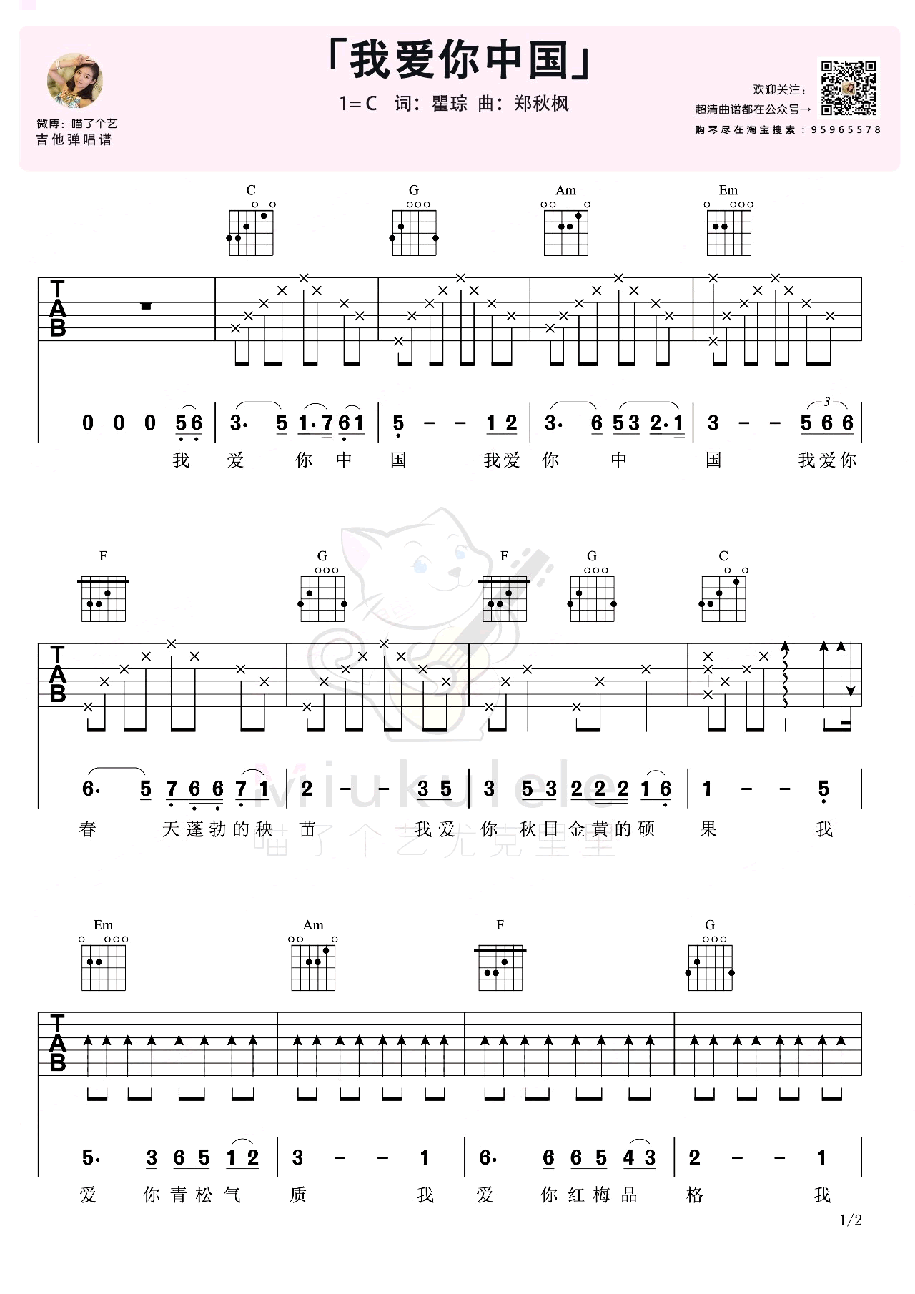 我爱你中国吉他谱,叶佩英原唱的一首经典爱国主题歌曲,我爱你中国六线谱,C调弹唱谱,两张高清图片谱,感谢喵了个艺编配出品...