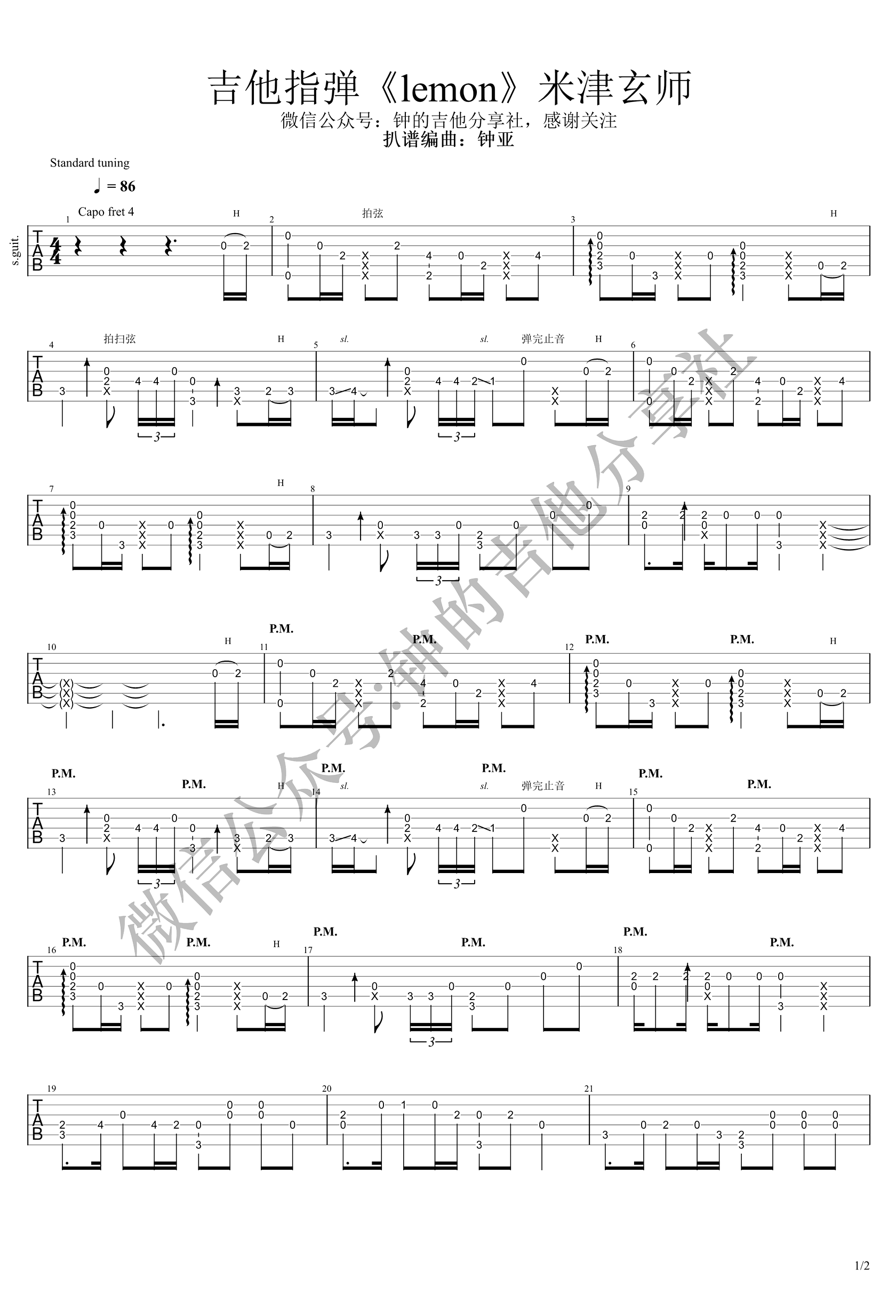 Lemon指弹谱,米津玄师经典代表作品,日剧《非自然死亡》主题曲改编,Lemon吉他独奏谱,钟的吉他分享社编配出品...