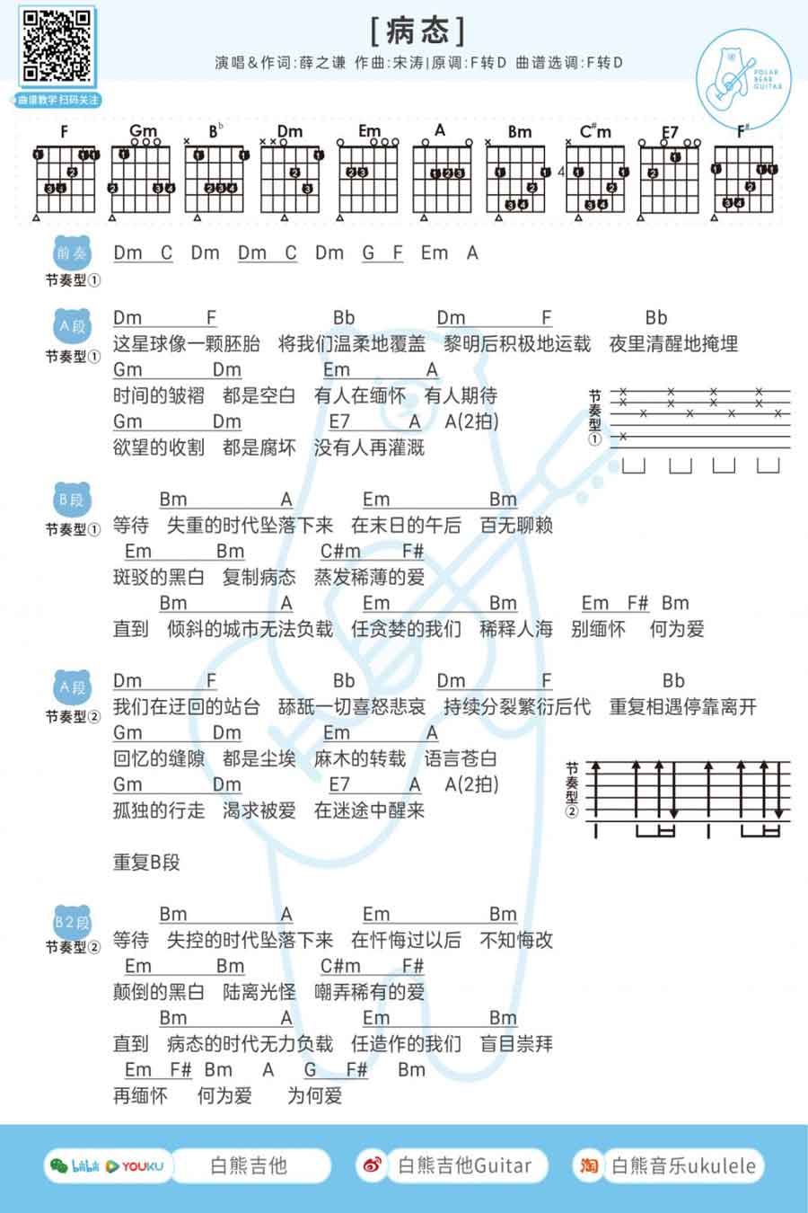 病态吉他谱,原调:F转D,曲谱采用原调和弦编配。薛之谦病态吉他演唱谱,共有一张高清图片六线谱。...