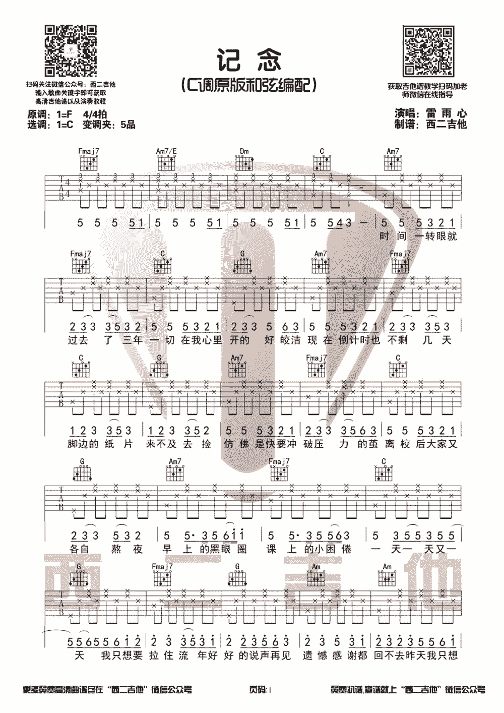 记念吉他谱,曲谱原调:F,本吉他谱选C和弦编配(CAPO:5品)。雷雨心记念吉他弹唱谱,谱子共三张图片六线谱。...