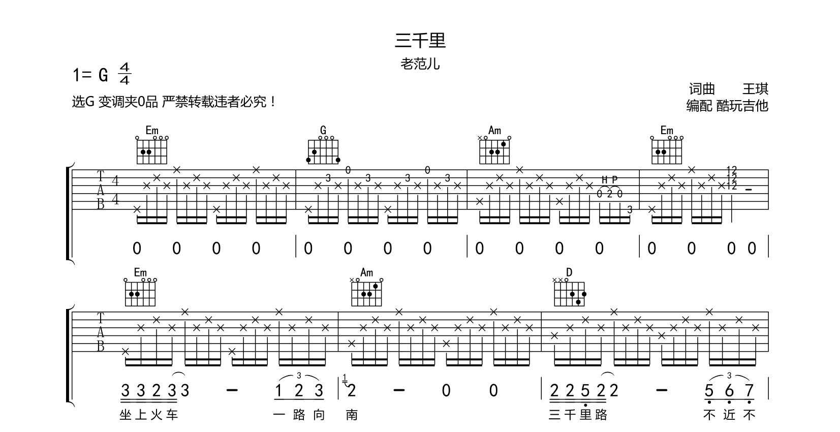 吉他三千里 吉他谱 老范儿演唱 词曲 王琪