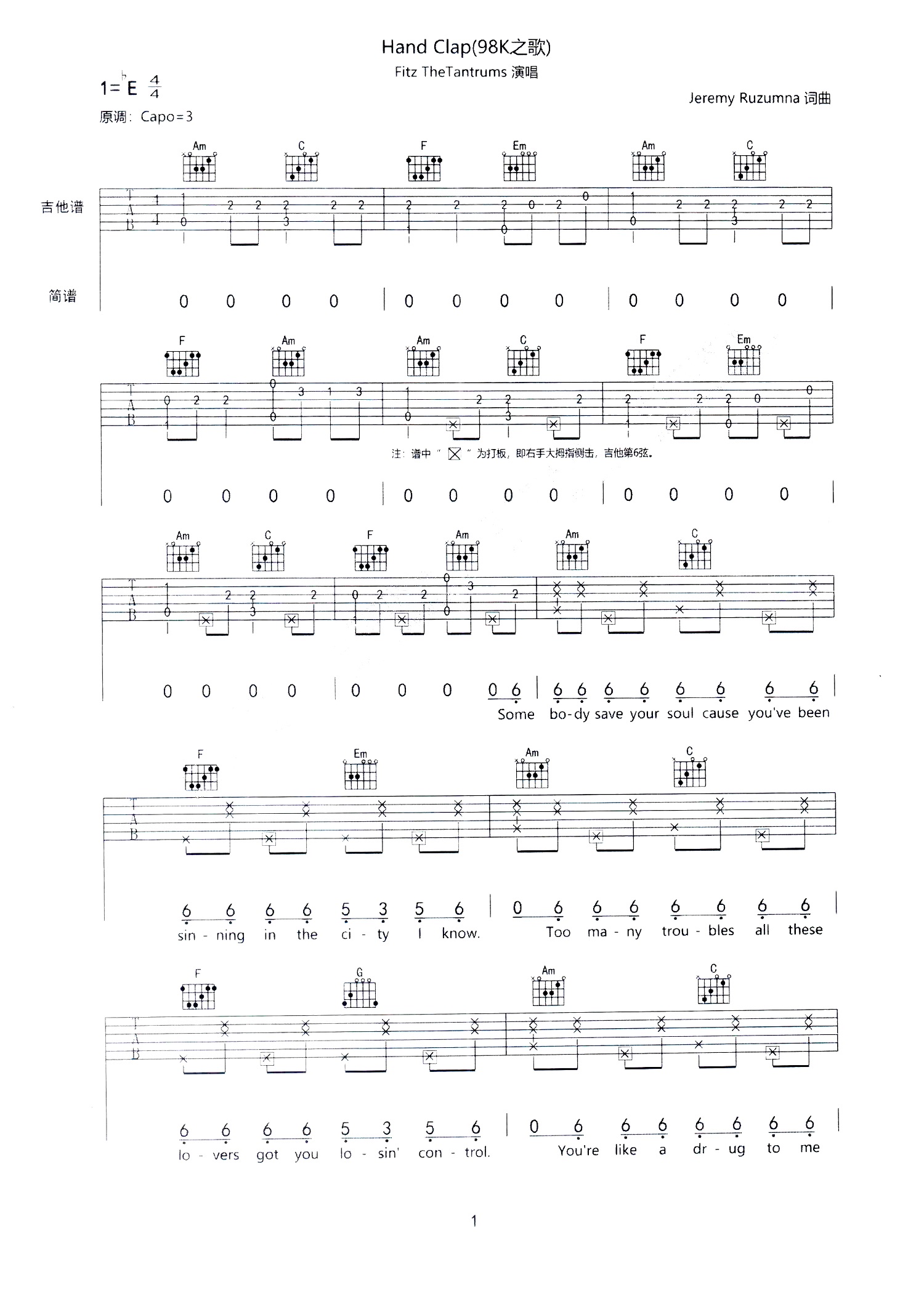吉他hand clap(98K之歌) 吉他谱弹唱 六线谱