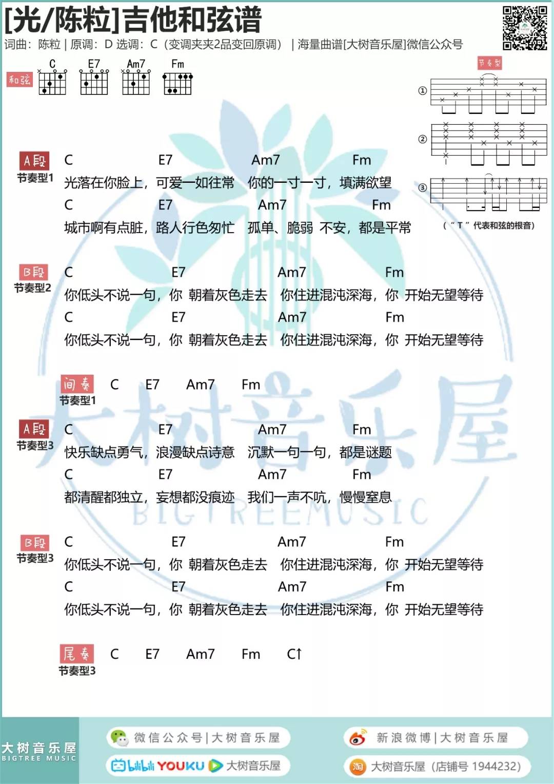 陈粒《光》吉他谱分享,来自大树音乐编配六线谱,附和弦谱和弹唱版视频教学视频讲解。C调指法,变调夹夹第二品即回原调D调。...