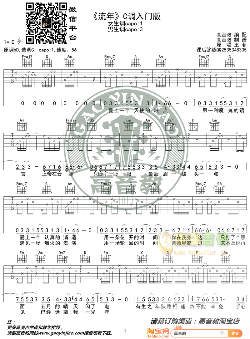 吉他王菲《流年》入门版 高音教编配 猴哥吉他教学