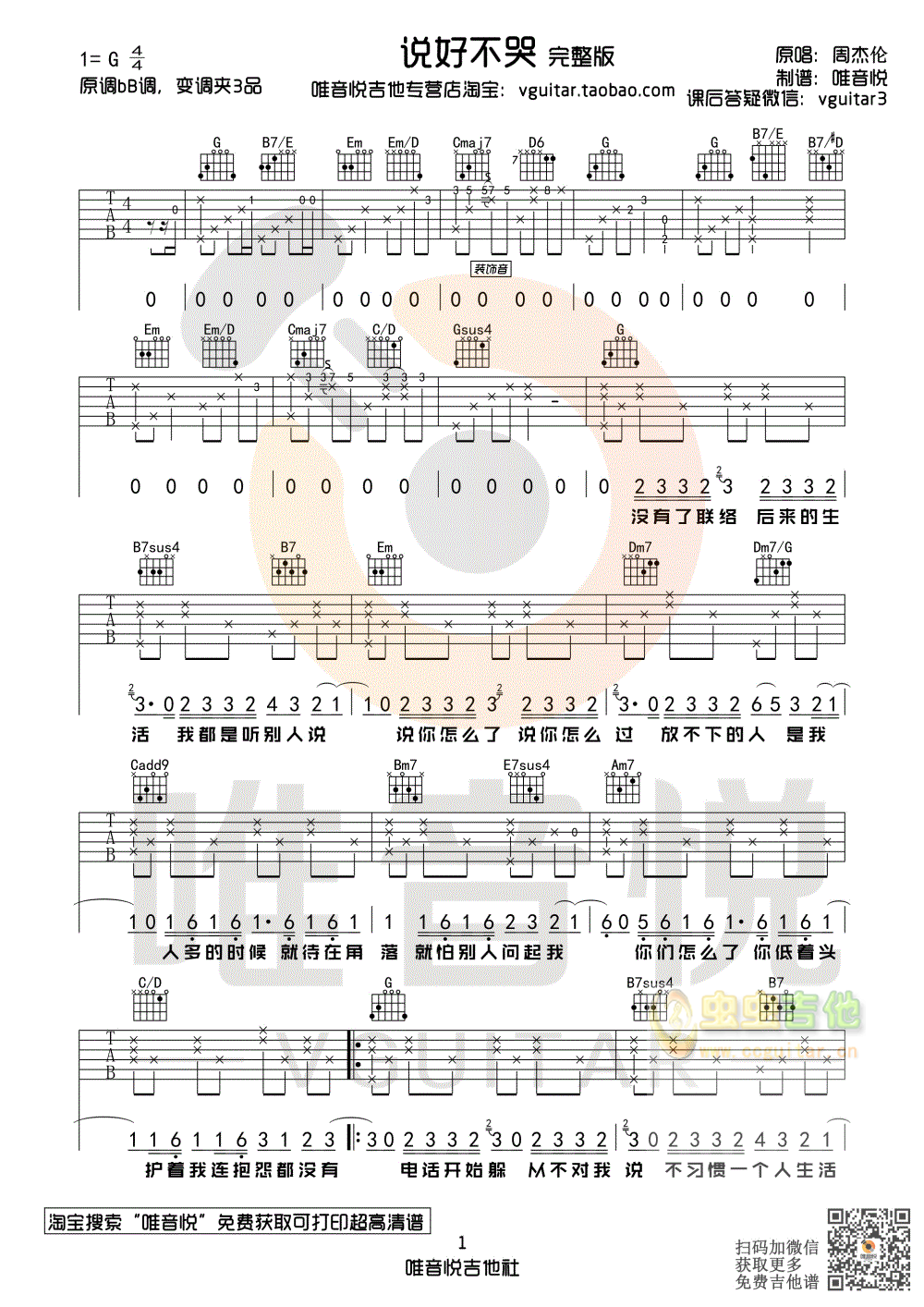 吉他周杰伦 说好不哭 原版 唯音悦制谱