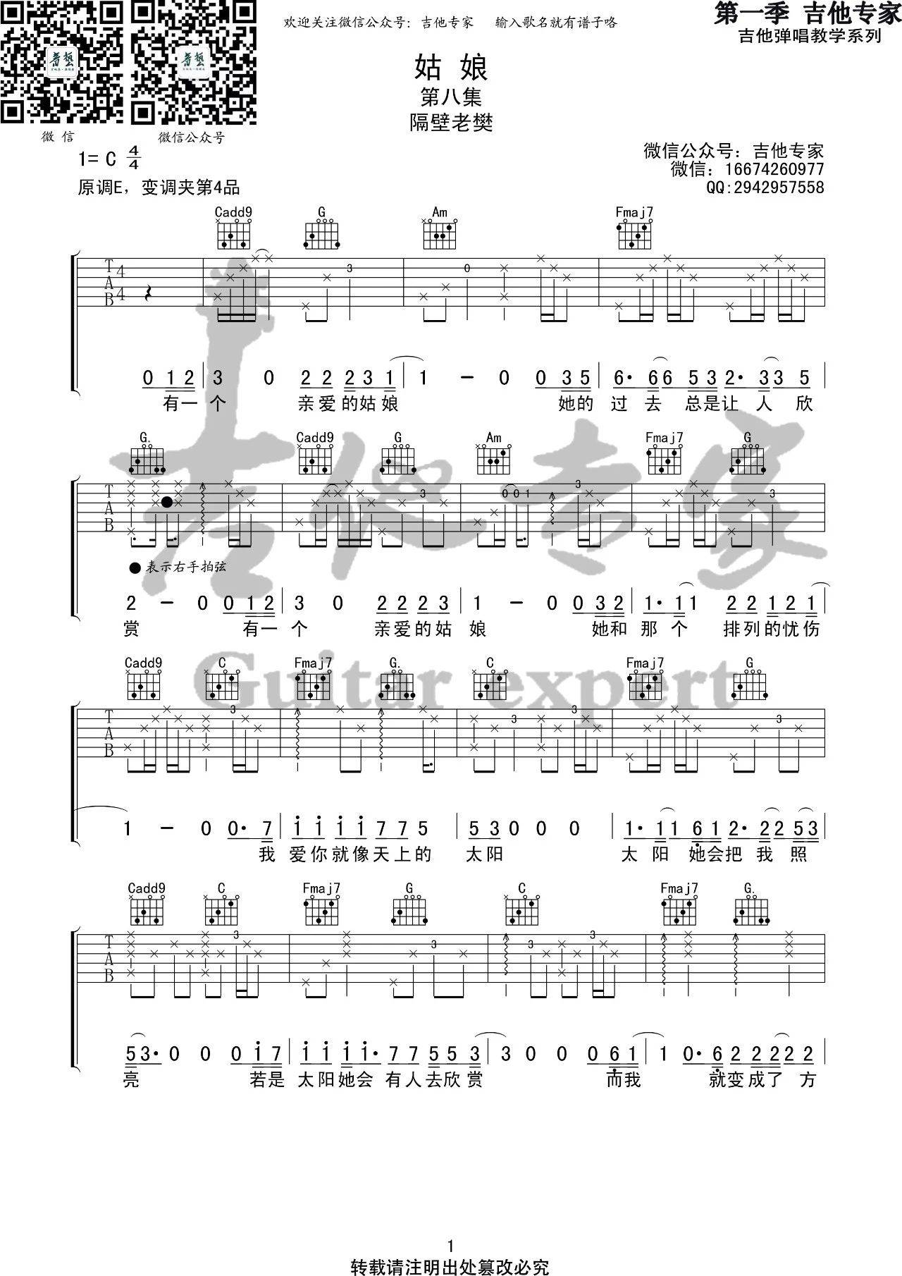 吉他隔壁老樊《姑娘》吉他谱_C调高清六线谱_音艺编配