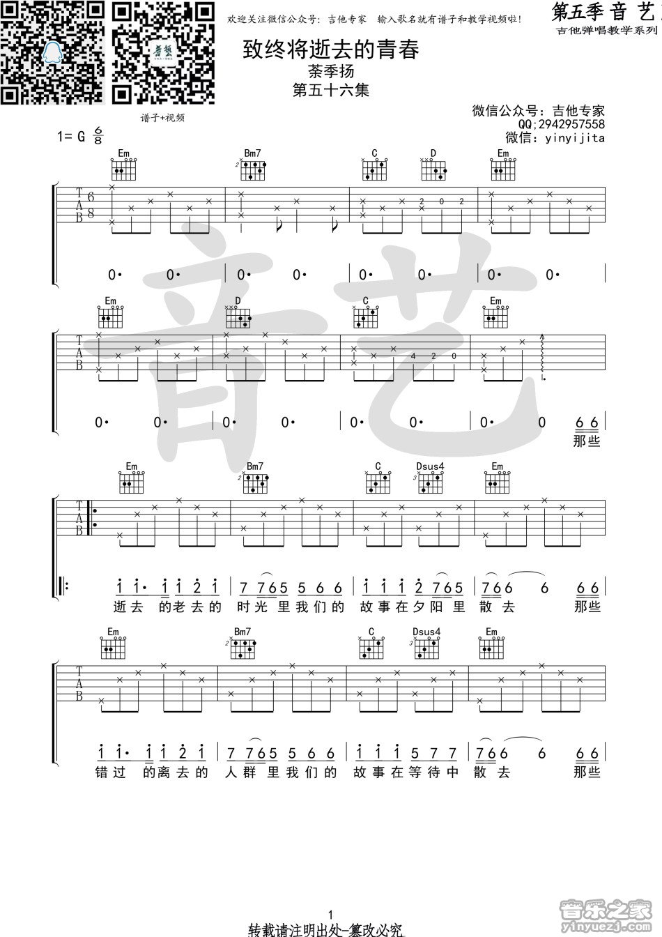 音艺G调版茶季杨《致终将逝去青春》吉他弹唱六线谱...