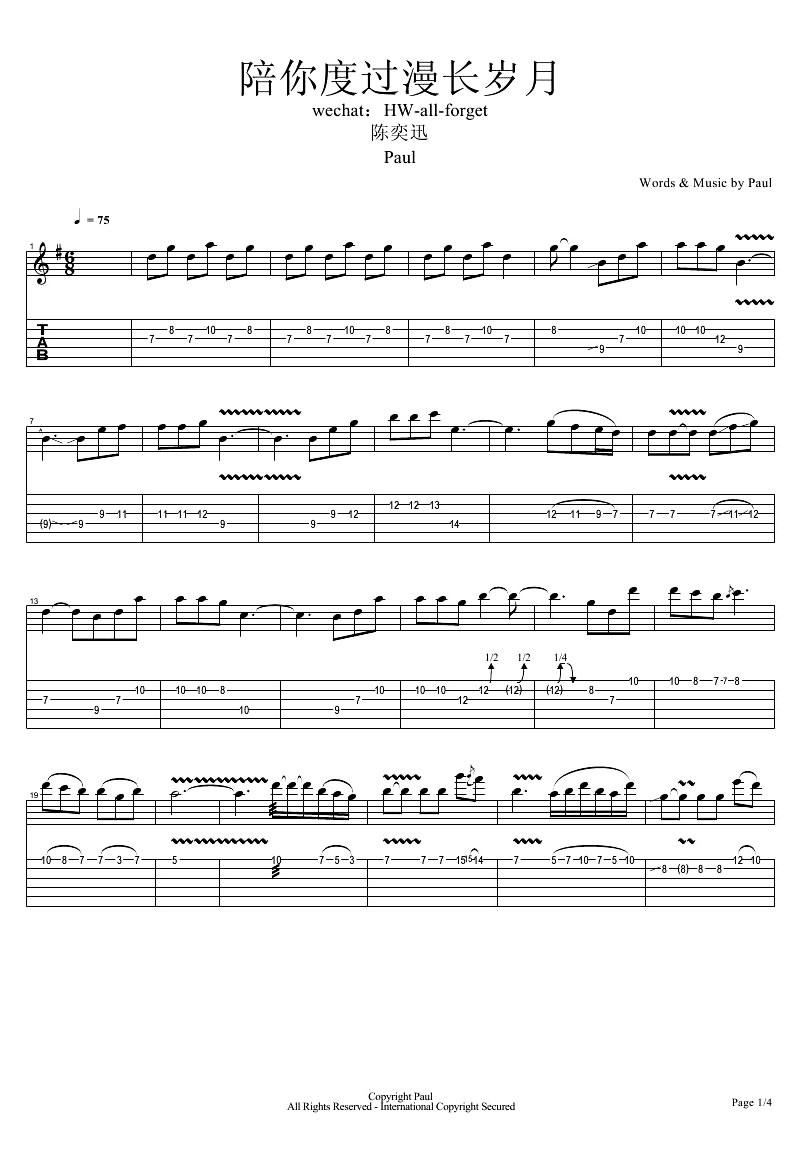 陪你度过漫长岁月吉他独奏谱,电吉他伴奏改编。...