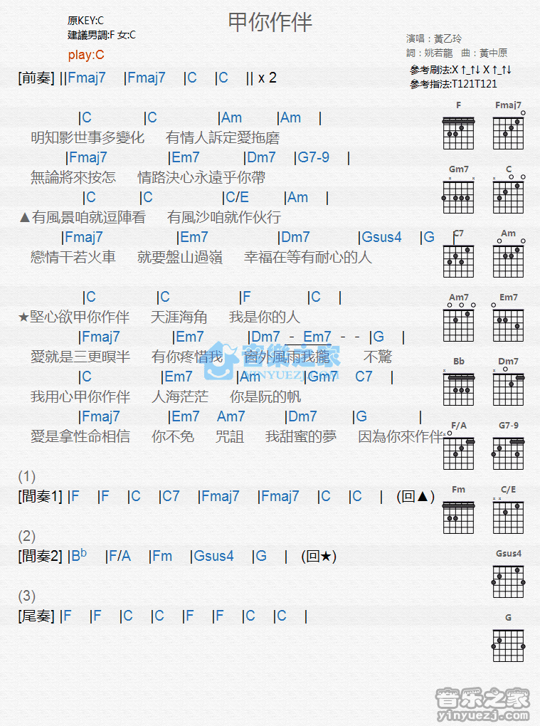 C调版黄乙玲《甲你作伴》吉他和弦弹唱谱...