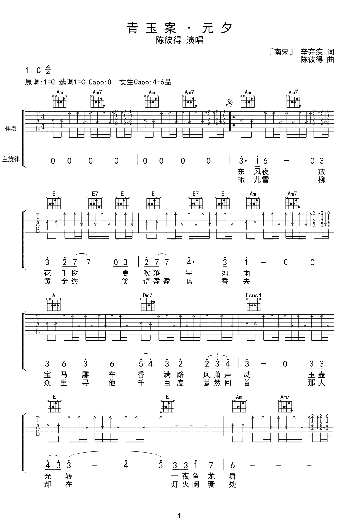 陈彼得《青玉案元夕》吉他谱,C调指法编配,一首用流行音乐诠释经典诗词的歌曲,青玉案元夕吉他弹唱谱,女生变调夹推荐4-6品。央视《经典咏流传》舞台,74岁的台湾音乐人陈彼得的这首歌曲燃烧了全场,掌声经久不息。当诗词被赋予再次的生命,一定是八百年前诗人最大的欣慰~...