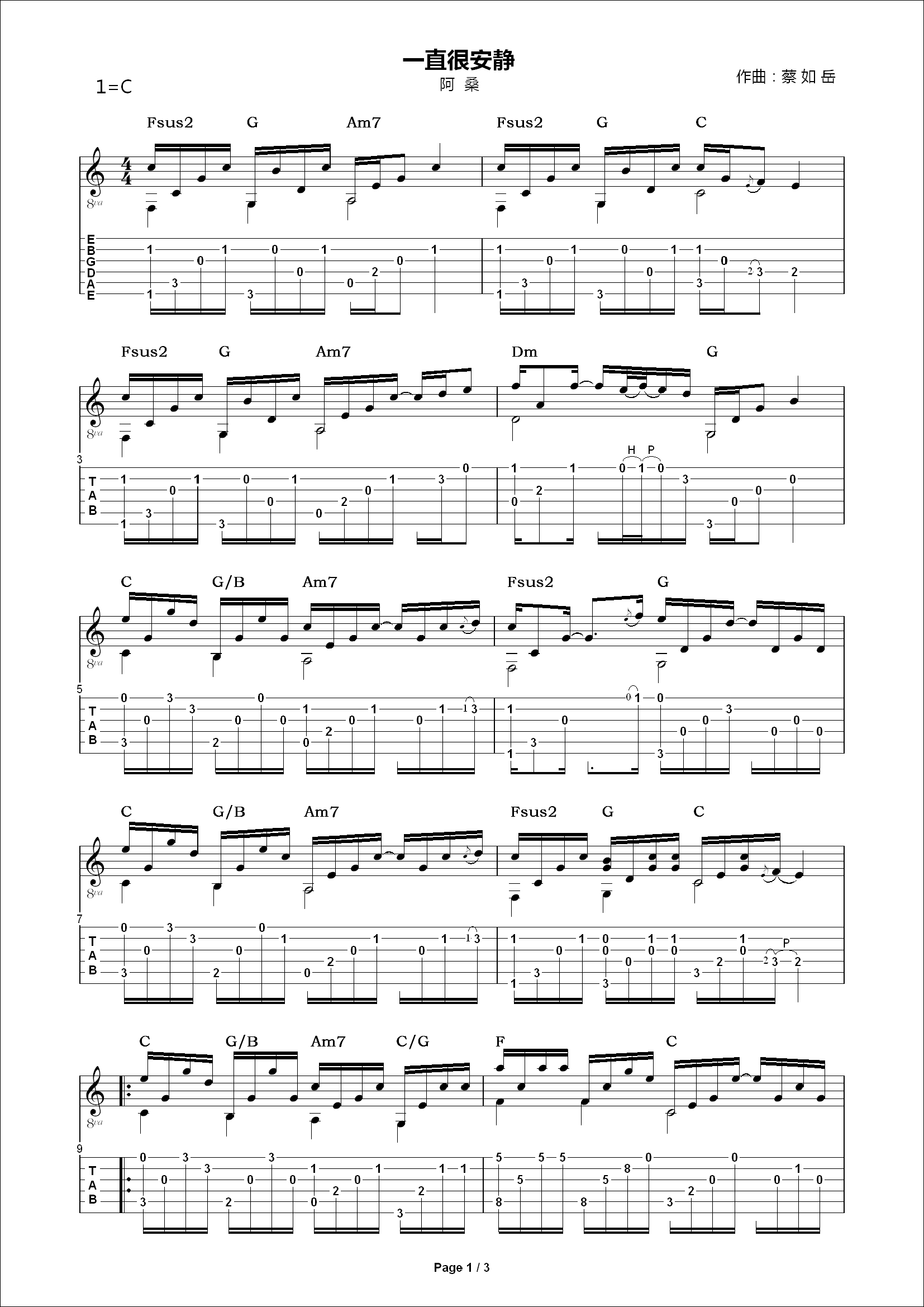 阿桑《一直很安静》吉他谱_C调吉他独奏谱...