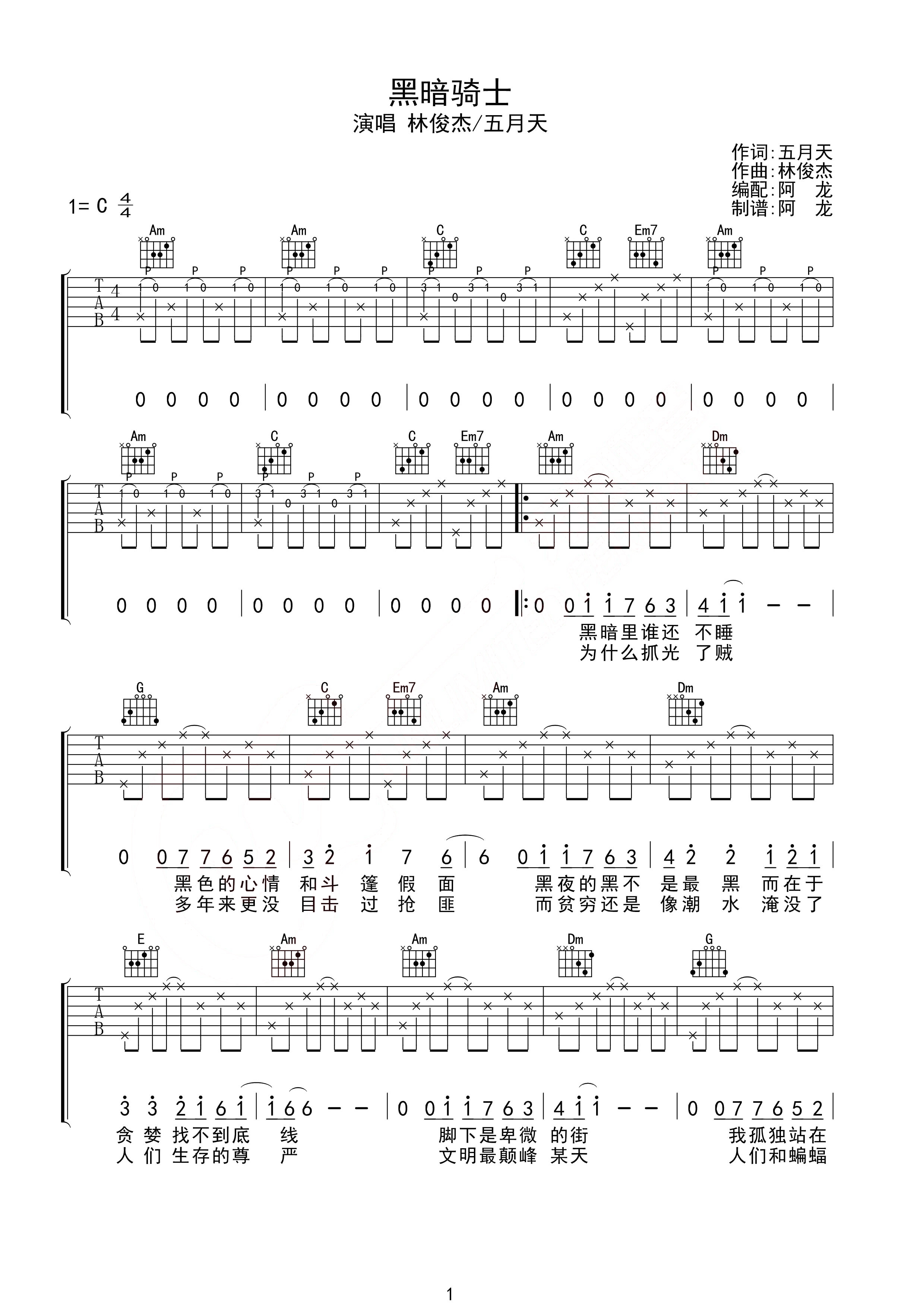 林俊杰/五月天《黑暗骑士》吉他谱_C调吉他弹唱谱...