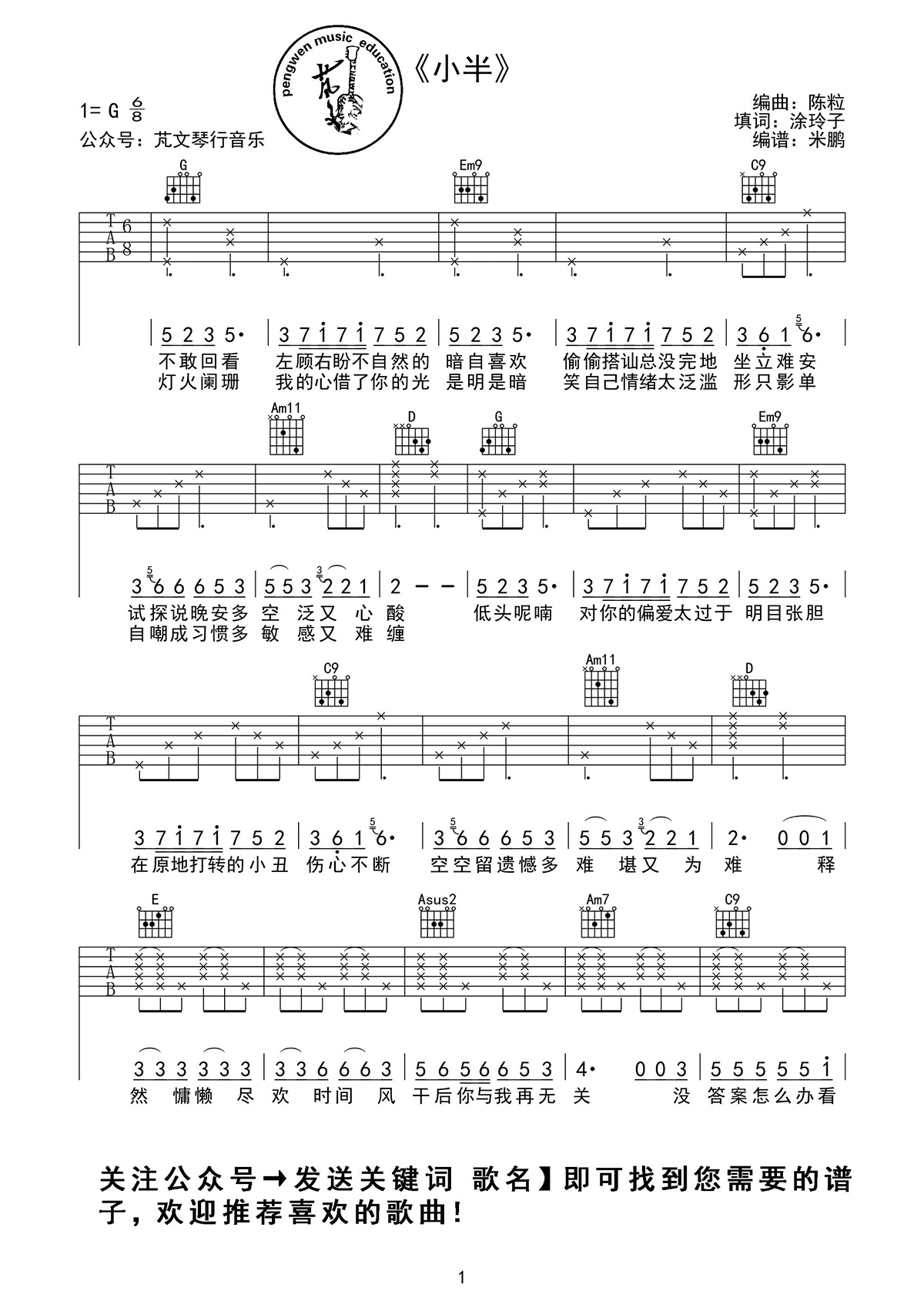 吉他陈粒《小半》吉他谱 G调原版弹唱谱 两个版本
