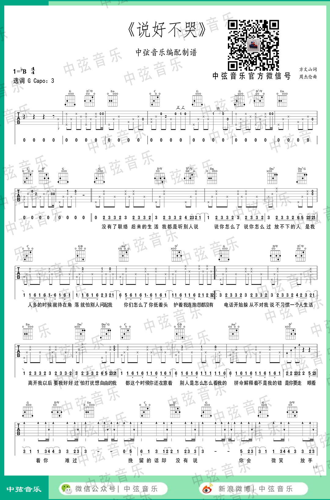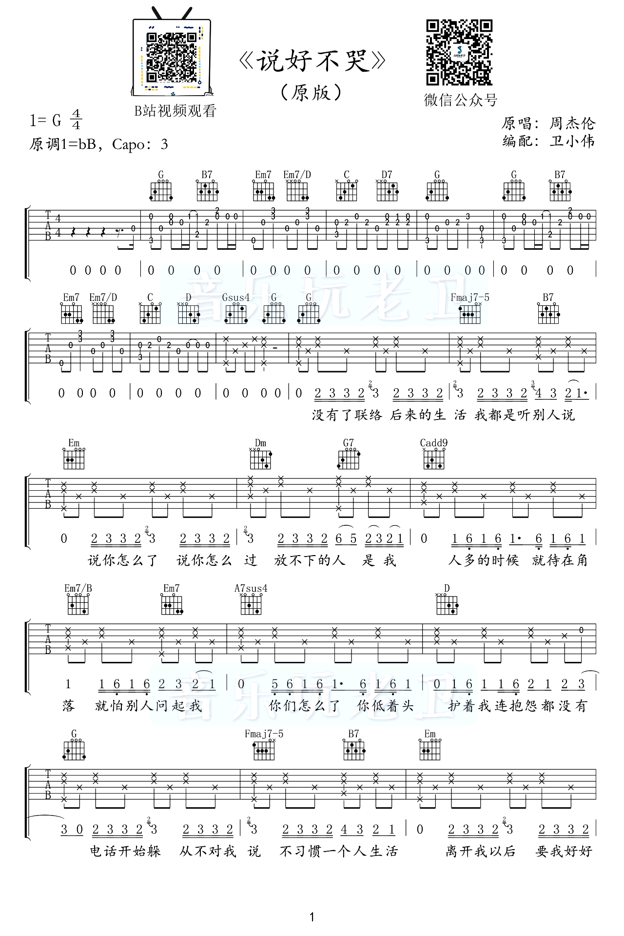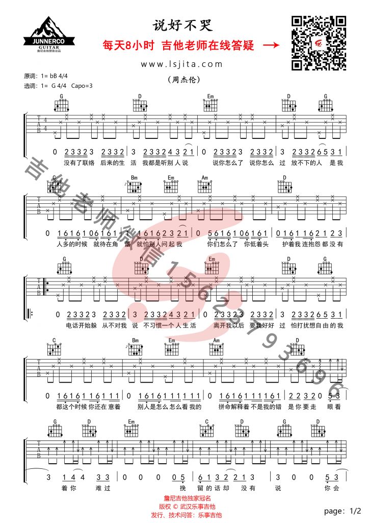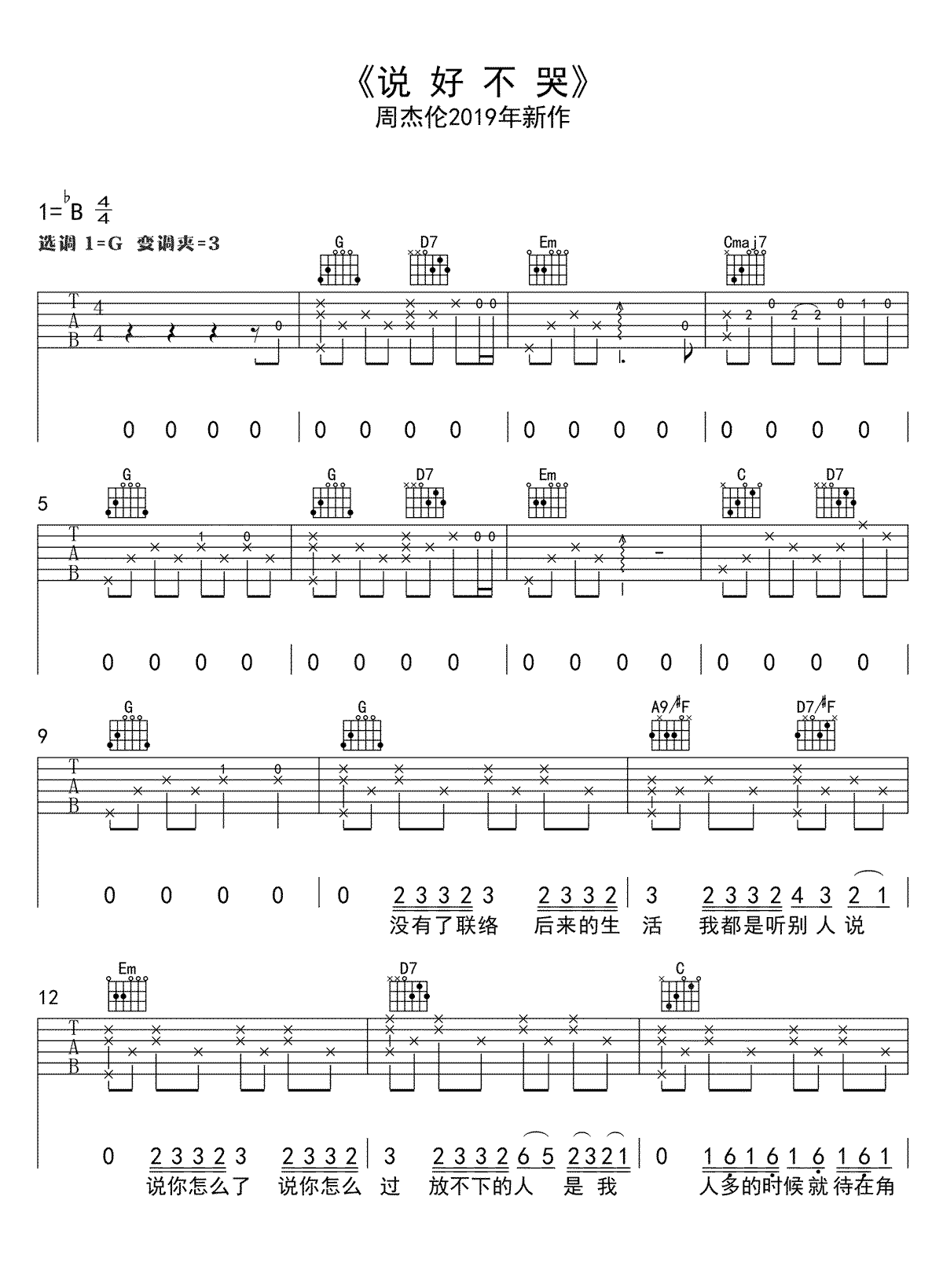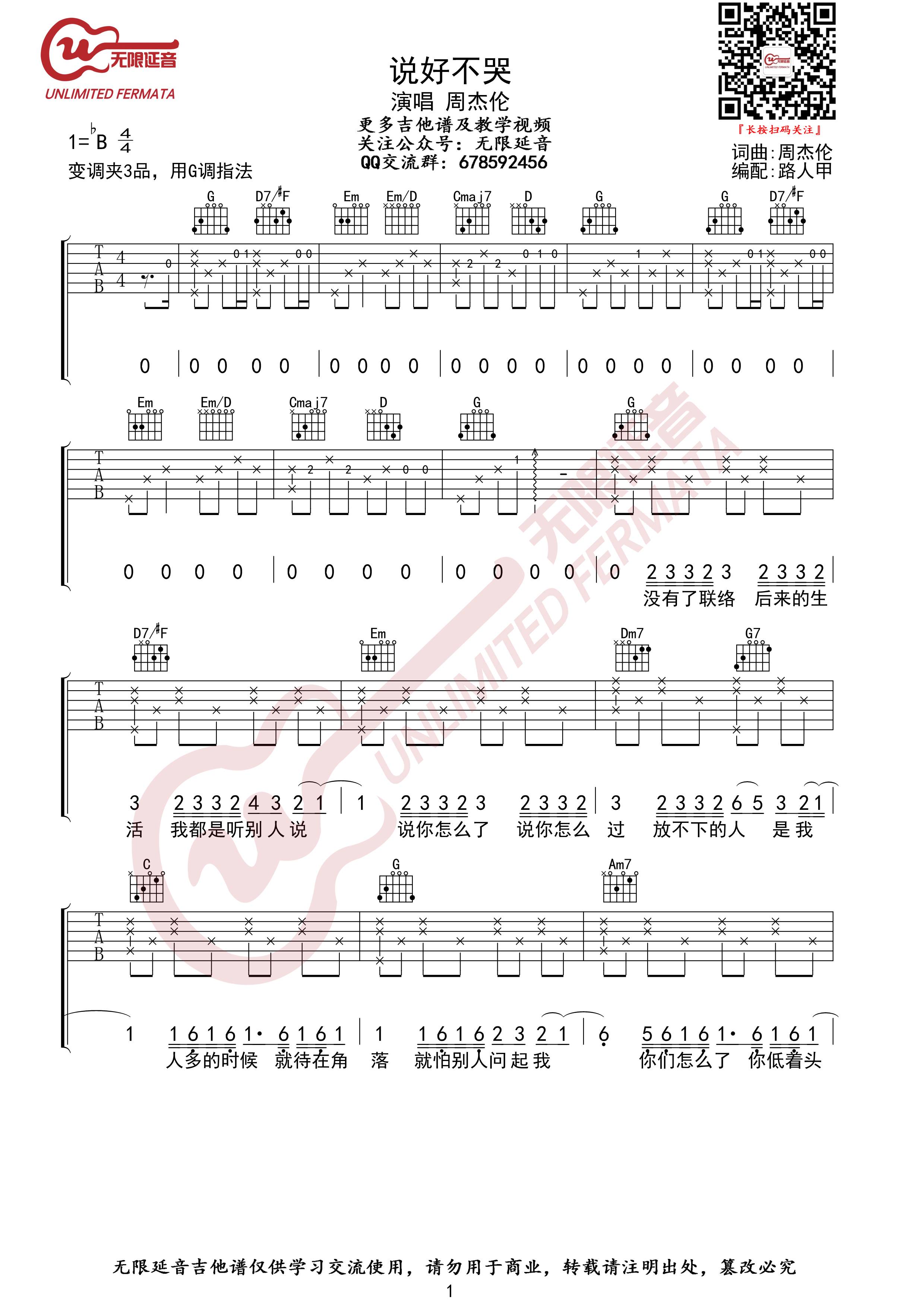 说好不哭吉他谱,选G调和弦编配,原调降B,变调夹=3品,周杰伦的Jay式情歌:说好不哭吉他弹唱谱,谱子一共六页图片六线谱,两个版本大家自行选择...