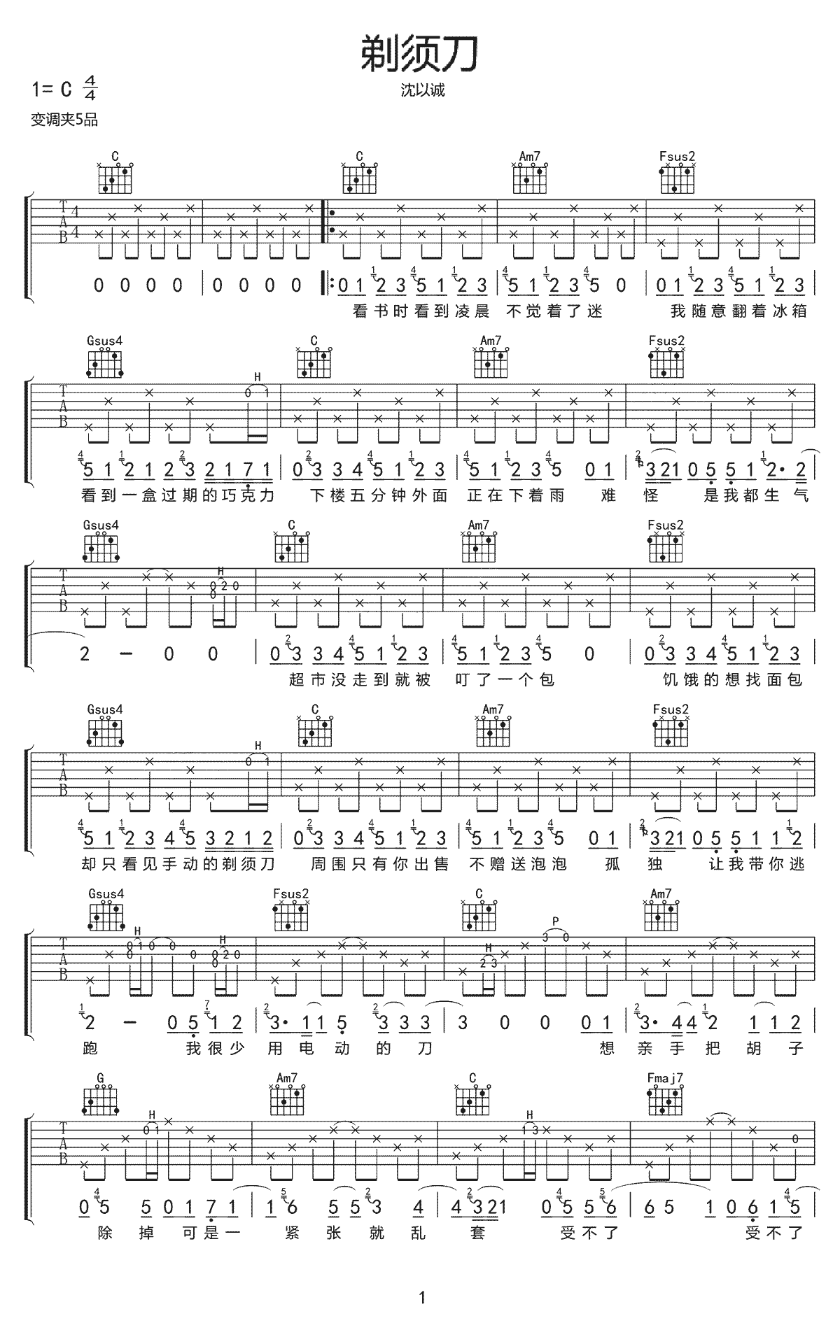 剃须刀吉他谱,C和弦指法编配,变调夹=5品。沈以诚《剃须刀》吉他弹唱六线谱,共有两页图片谱子来自网络分享...