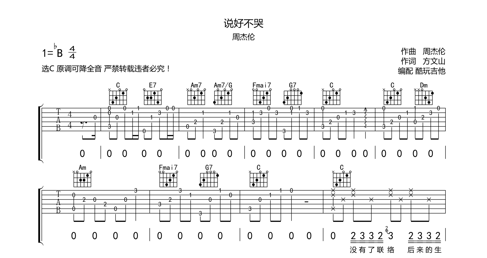 周杰伦《说好不哭》原版吉他谱,原调bB,选用G调,Capo夹三品。说好不哭六线谱,三张图片谱,感谢卫小伟编配...