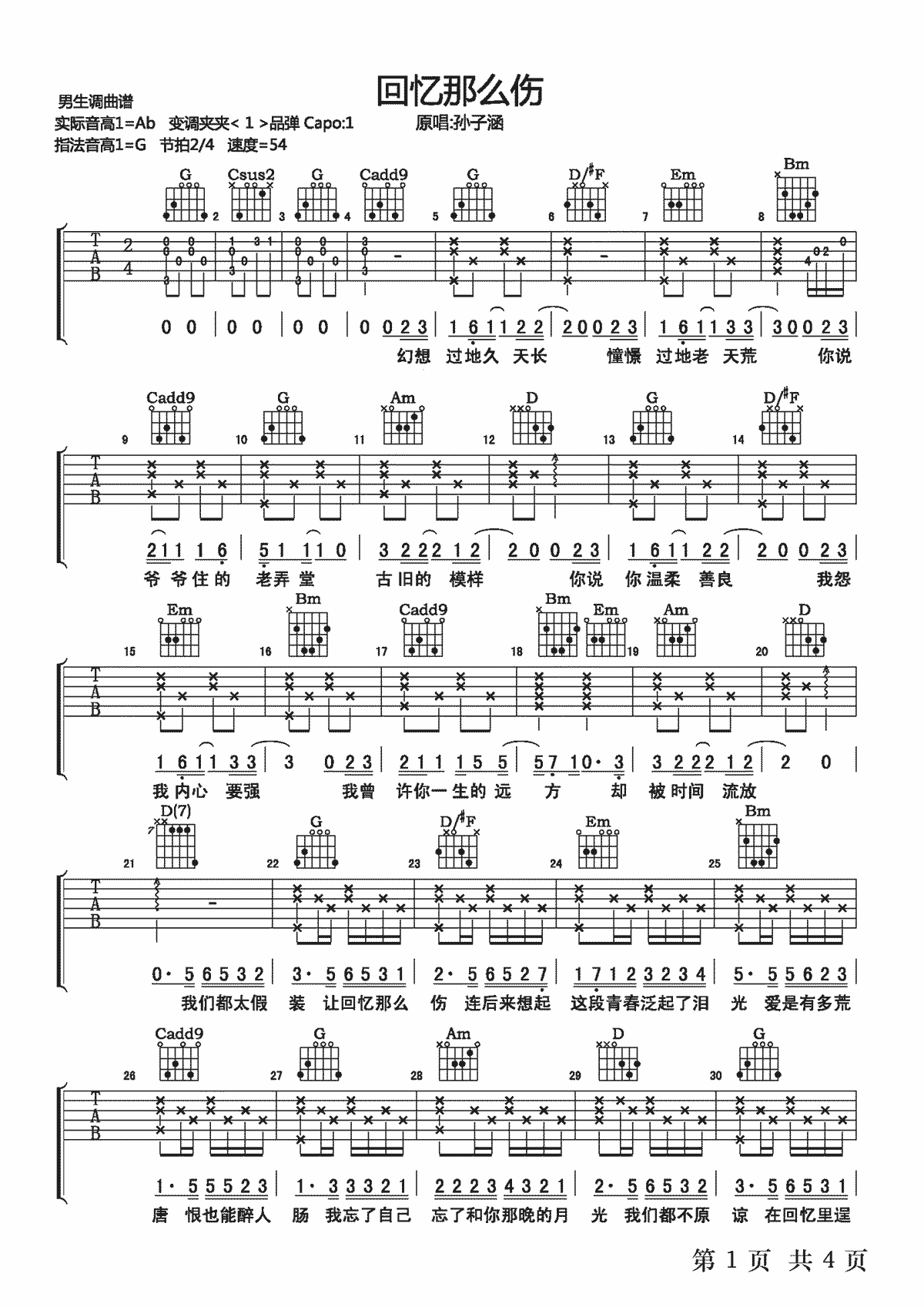 回忆那么伤吉他谱,G调和弦指法编配,变调夹=1品。孙子涵《回忆那么伤》吉他弹唱谱,一共四页图片六线谱...