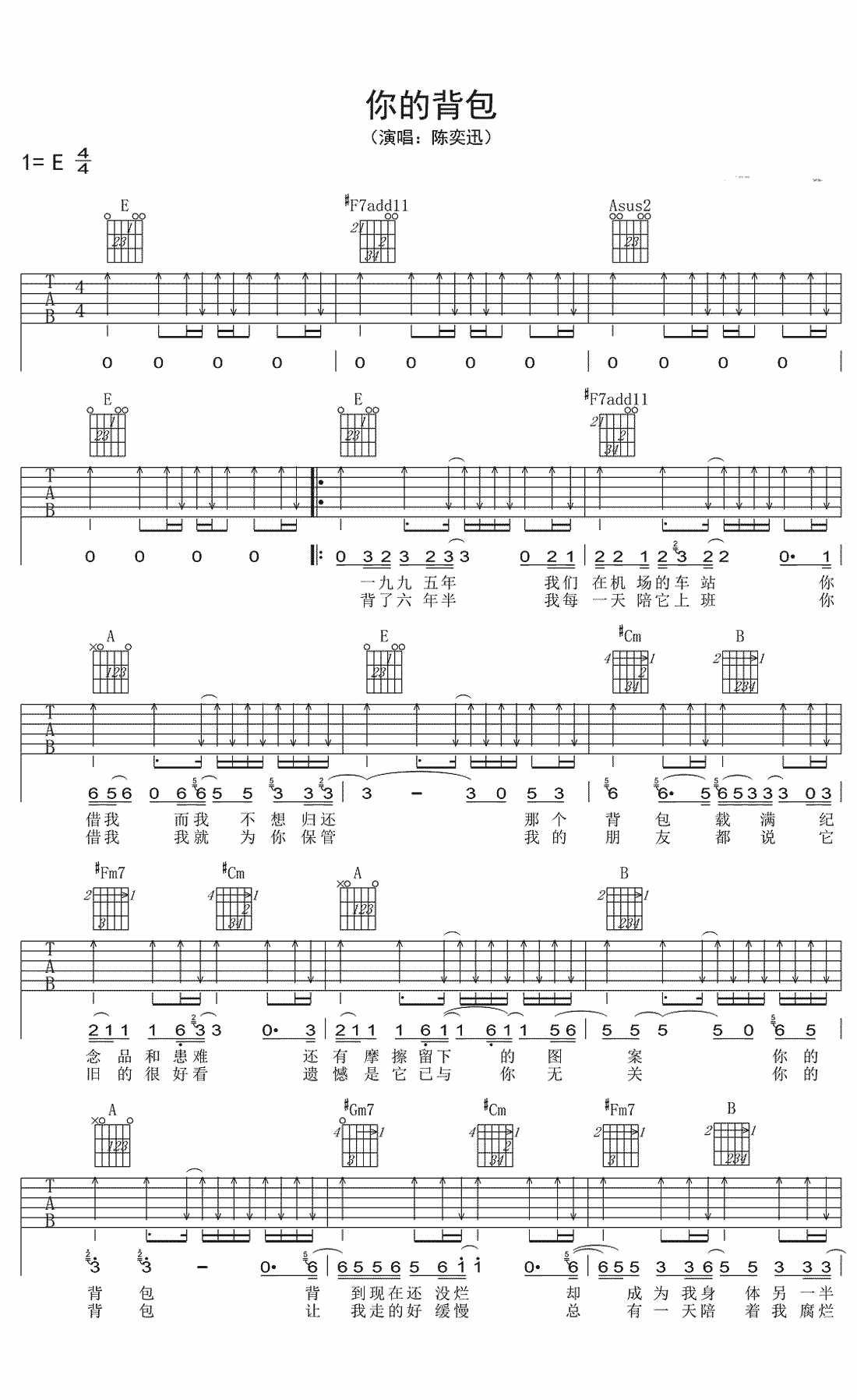你的背包吉他谱,分别选E和G和弦编配。陈奕迅《你的背包》吉他弹唱谱,曲谱一共四页,两个版本图片六线谱...
