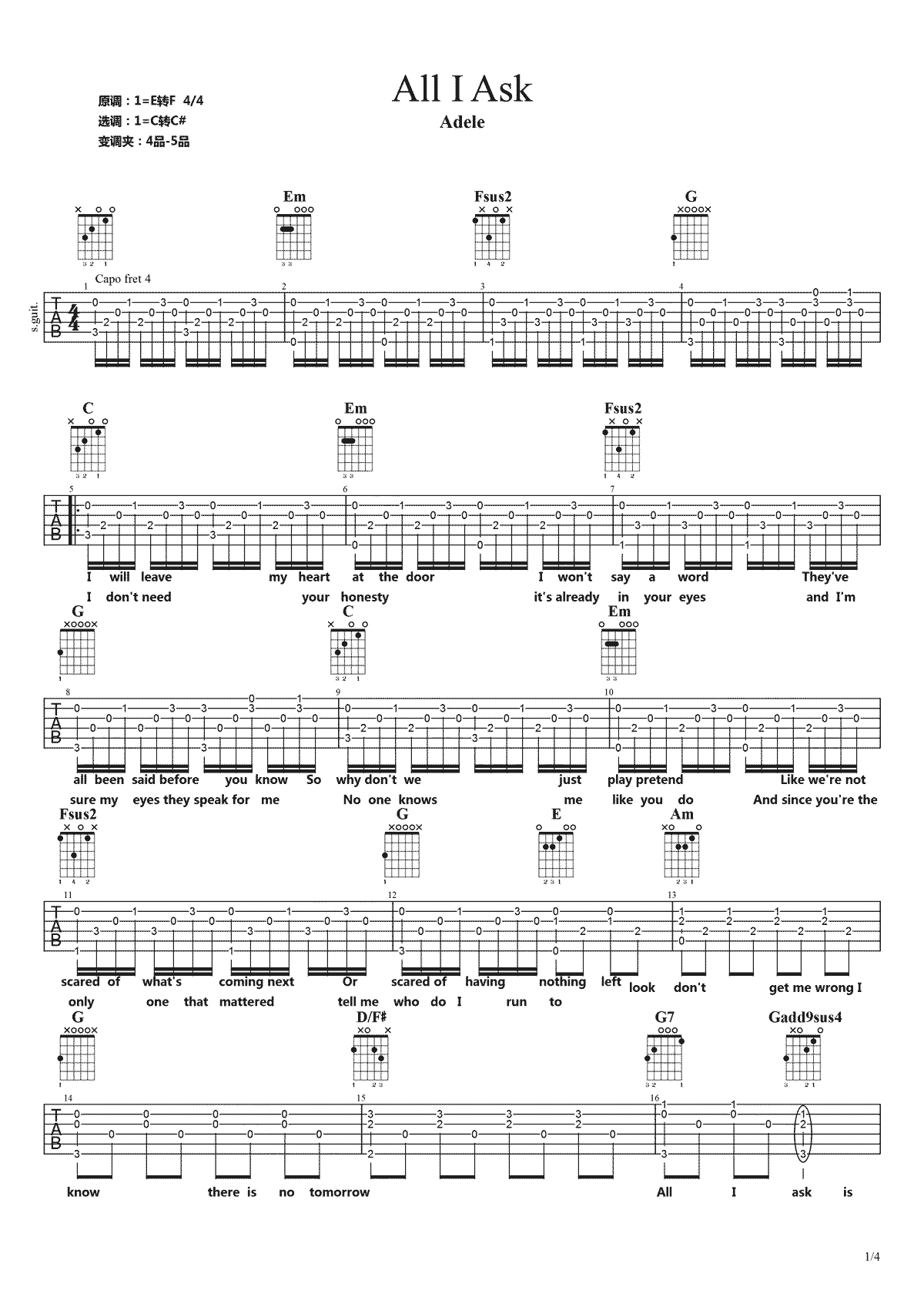 llIAsk吉他谱,原调:1=E转F,选C转C#和弦指法编配,变调夹:4-5品。Adele《AllIAsk》吉他弹唱谱,共有四张图片六线谱...