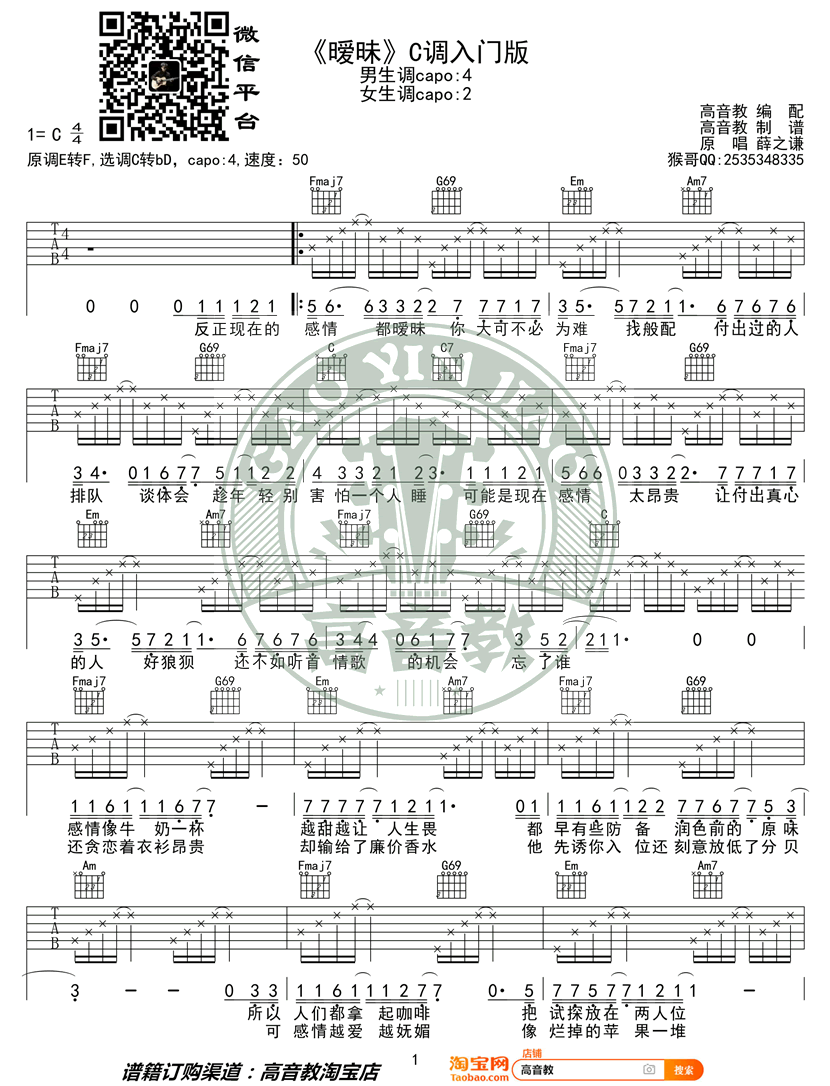 《暧昧》吉他谱,薛之谦的一首让人单曲循环的歌曲,原调E转F,选调C转bD,男生调Capo夹四品,女生调夹二品。暧昧六线谱,入门版编配,高音教出品...