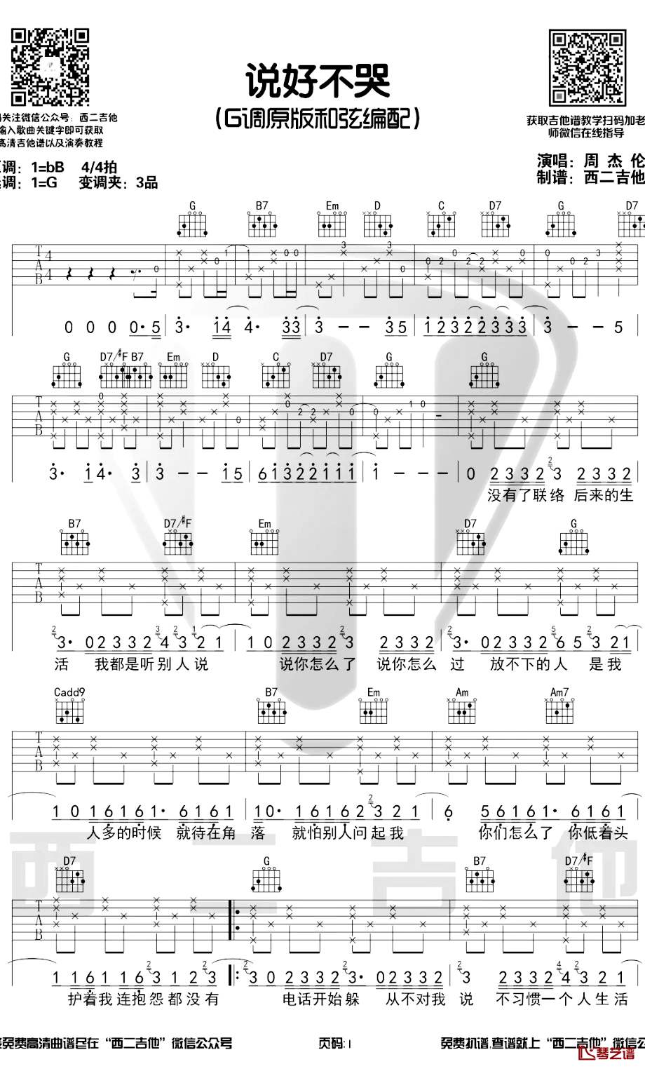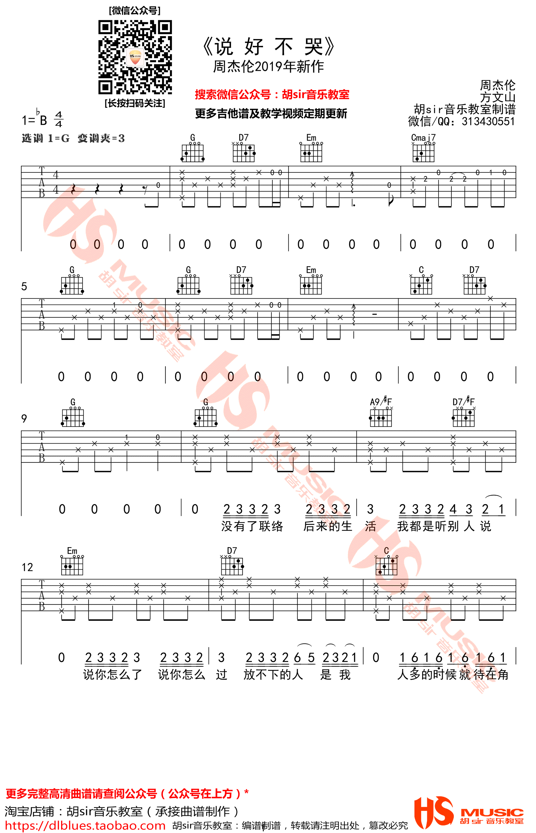 说好不哭》吉他谱,周杰伦2019年的新歌,说好不哭六线谱,原调降B,选调G,变调夹夹第三品。三张高清弹唱图片谱。感谢胡sir音乐教室编配出品...