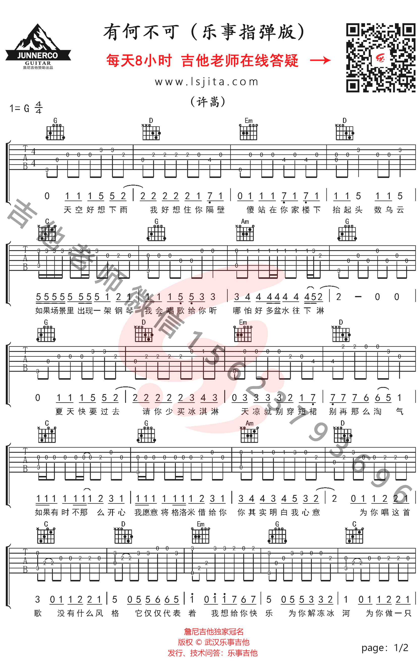 《有何不可》吉他指弹谱,许嵩的一首经典流行歌曲,G调编配,有何不可吉他独奏谱,乐事吉他出品...