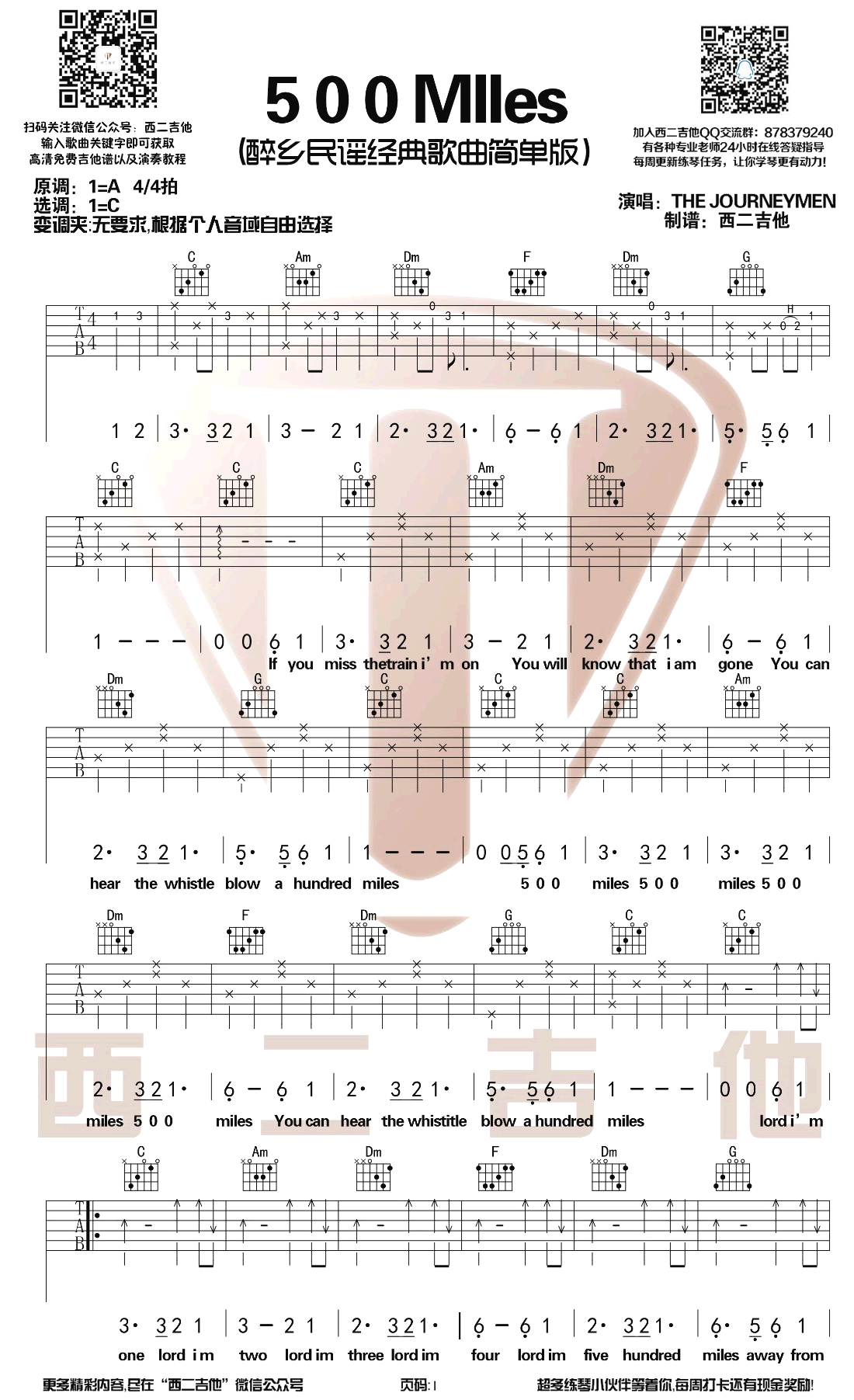 500miles吉他谱,一首非常好听的经典英文歌曲,醉乡民谣《离家五百里》六线谱,原调A,选调C,变调夹没有要求,大家根据个人音域自由选择。西二吉他编配出品...