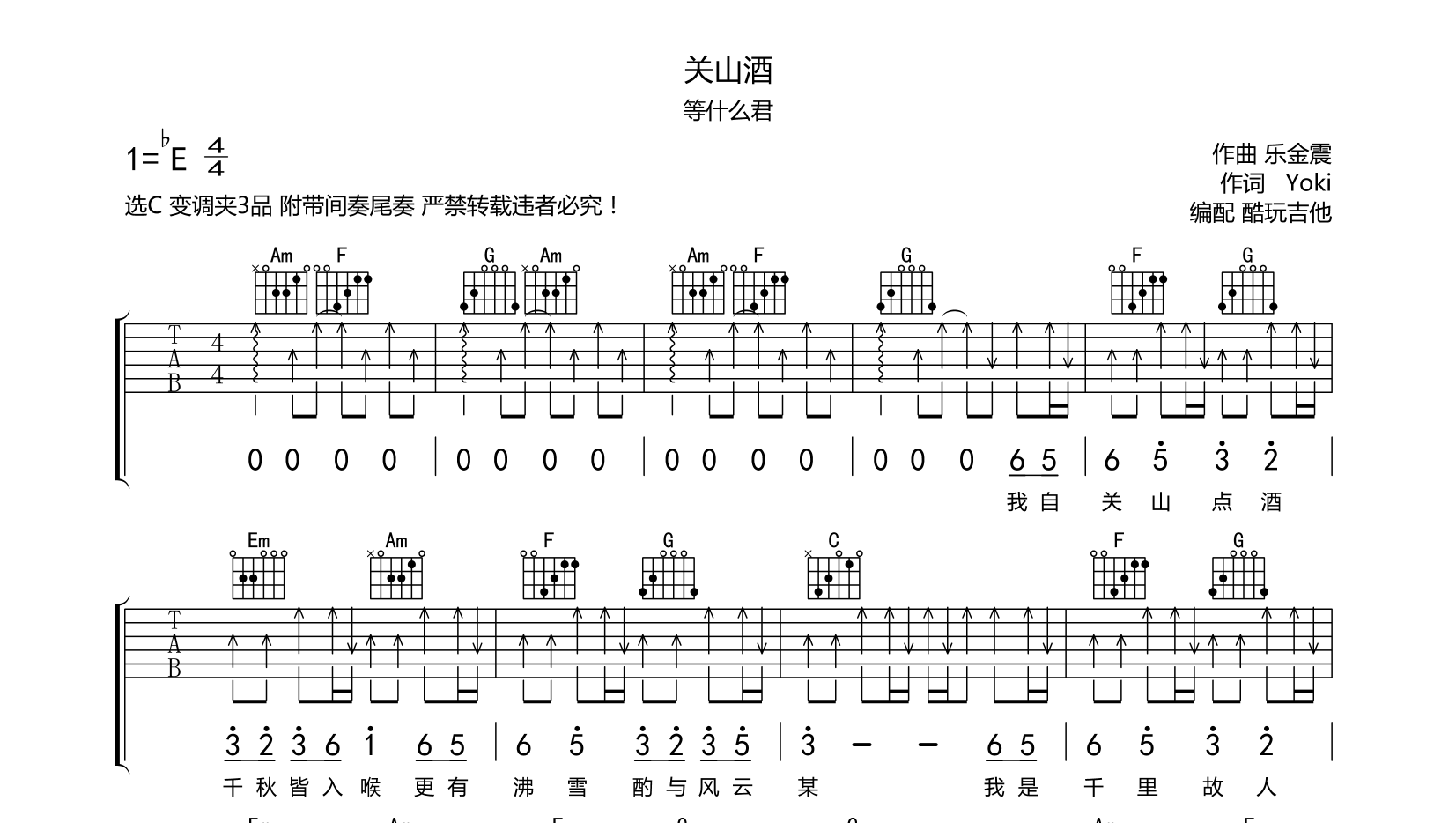 吉他关山酒 吉他谱等什么君 六线谱 原版编配 古风曲目