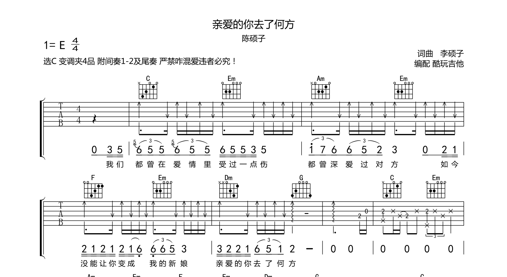 吉他亲爱的你去了何方 吉他谱 陈硕子 六线谱 简谱 抖音热曲